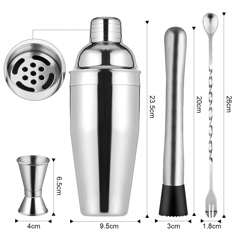 Шейкер 3 шт. 750 мл складається з металевої чашки, кришки з ситечком і кришки. Він дозволяє змішувати, фільтрувати і розливати напої. Він простий у використанні. Використовується як початківцями, так і досвідченими барменами.