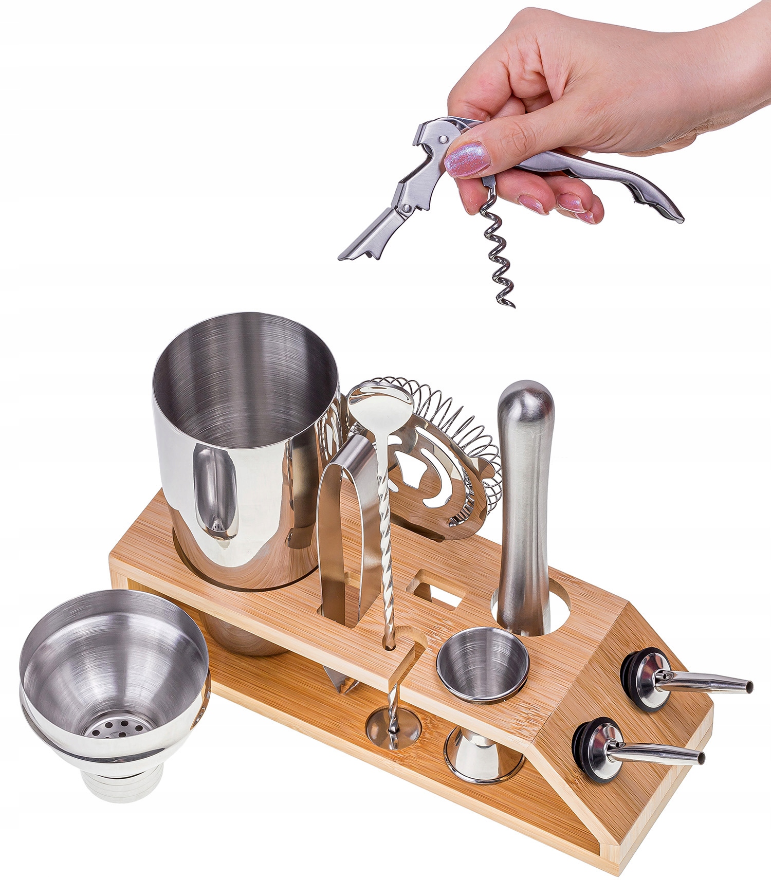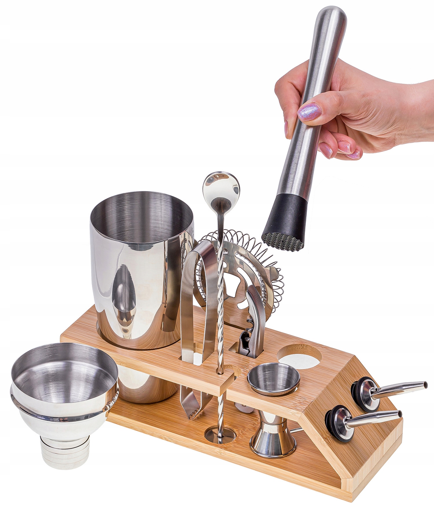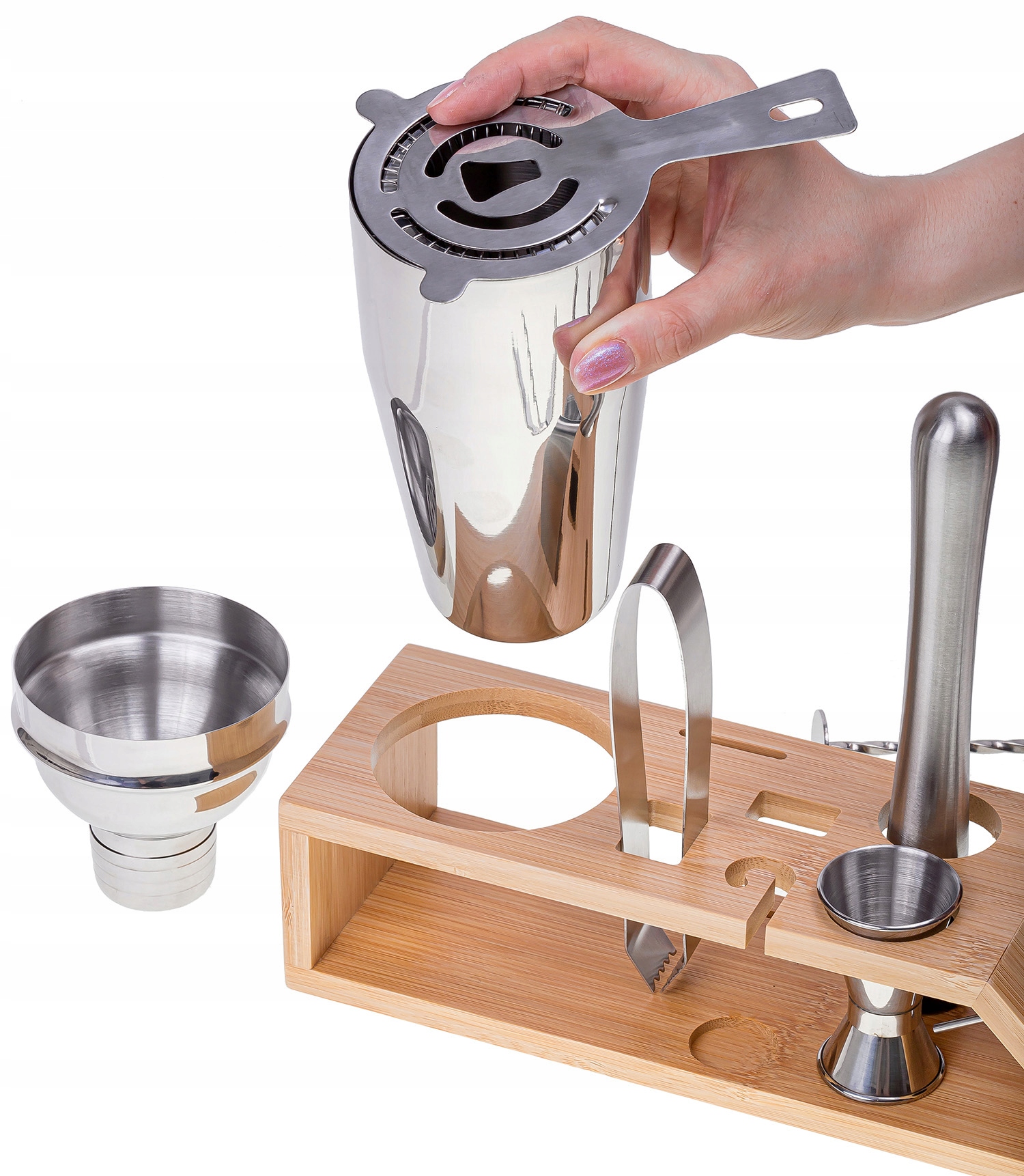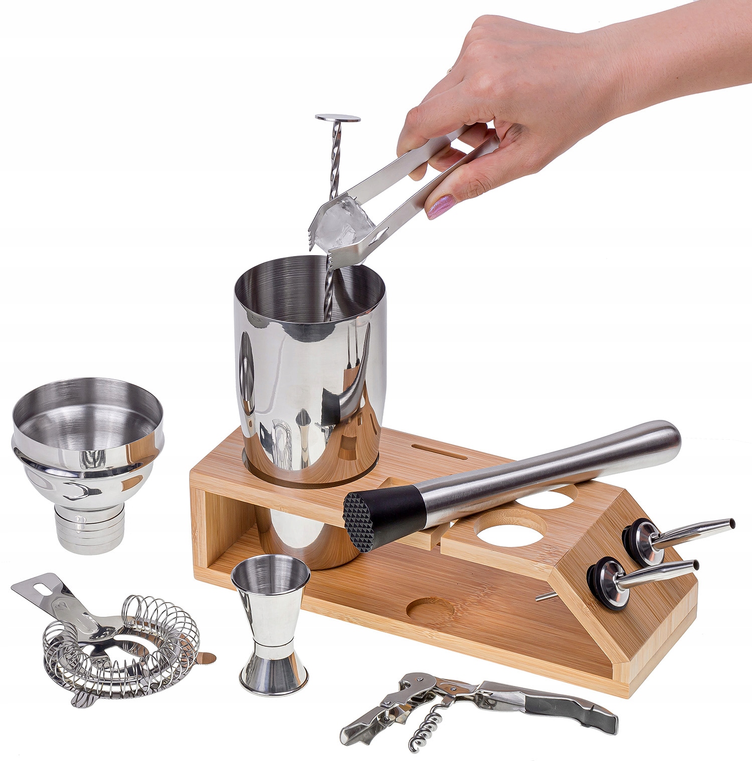 Набір бармена з нержавіючої сталі з підставкою з бамбука - це насамперед пропозиція для тих, хто хоче легко та зручно готувати напої.