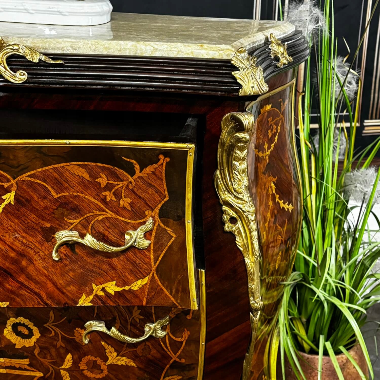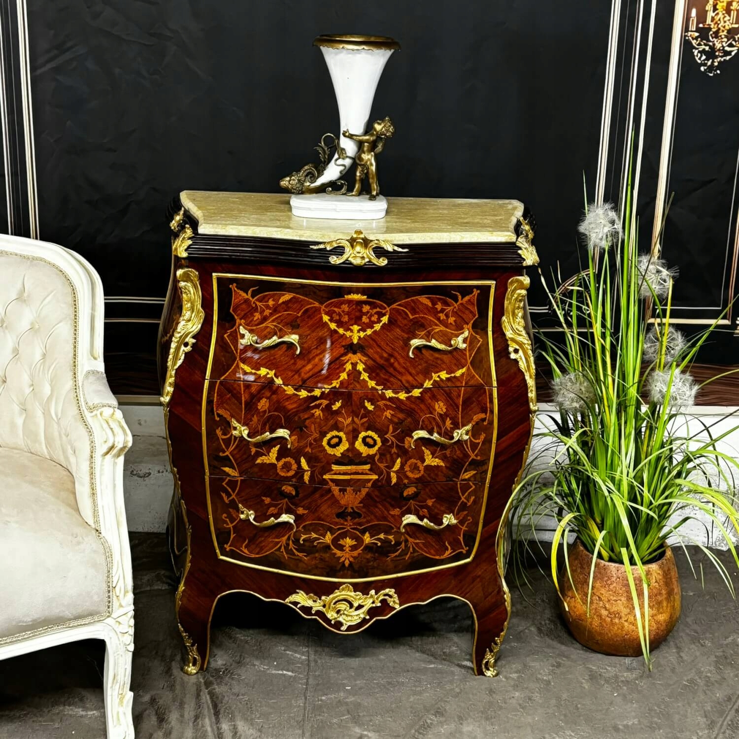 Якщо ви мрієте про повний інтер’єр класу, це скриня в стилі Луї XV відповідатиме вашим очікуванням. Зроблено з максимальною увагою до деталей, прикрашеними руками - інкрустованим , привертає увагу і додає благородного символу інтер’єру. Кульмінація структури - це елегантний мармуровий верх , який не тільки підкреслює розкішний вигляд меблів, але й надзвичайно практичний.