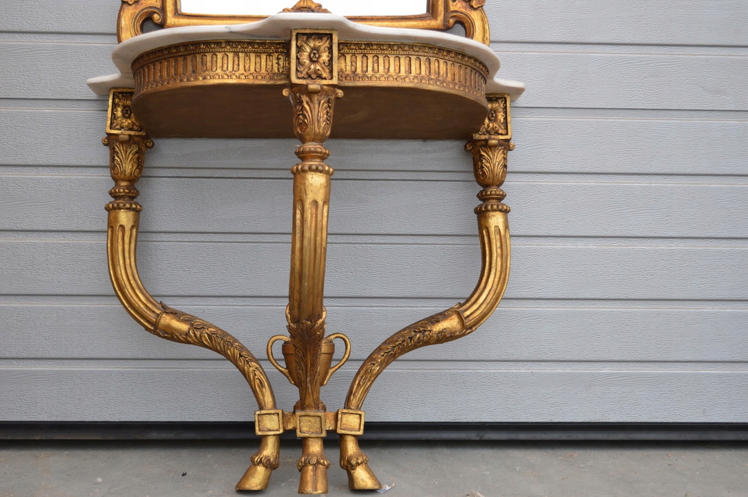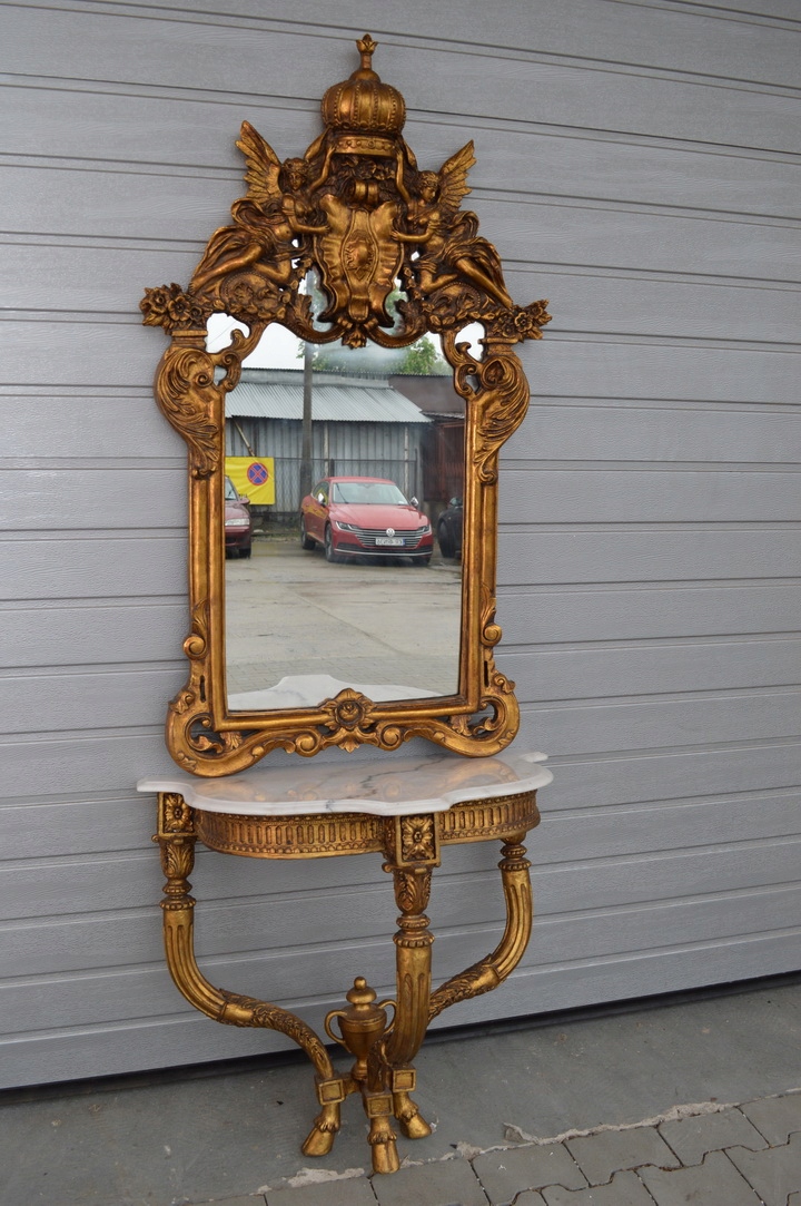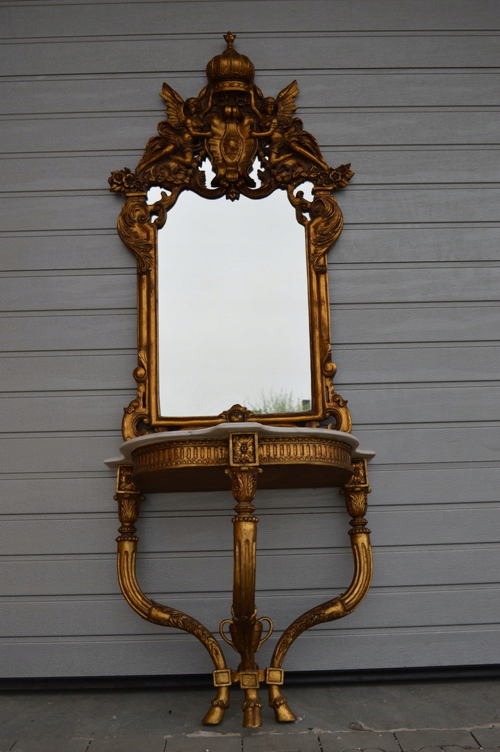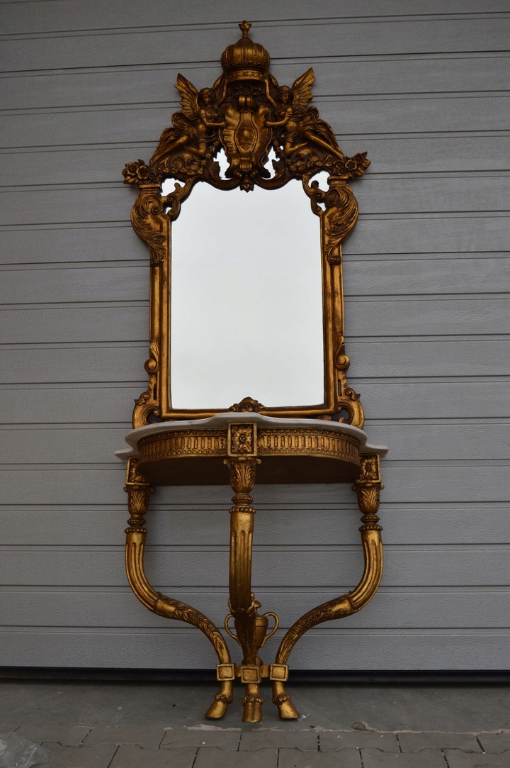 Здрастуйте, сьогодні я хочу запропонувати вам неймовірне золоте різьблене кришталеве дзеркало в красивій рамі з консоллю. Верх консолі з мармуру, дуже добротної роботи.