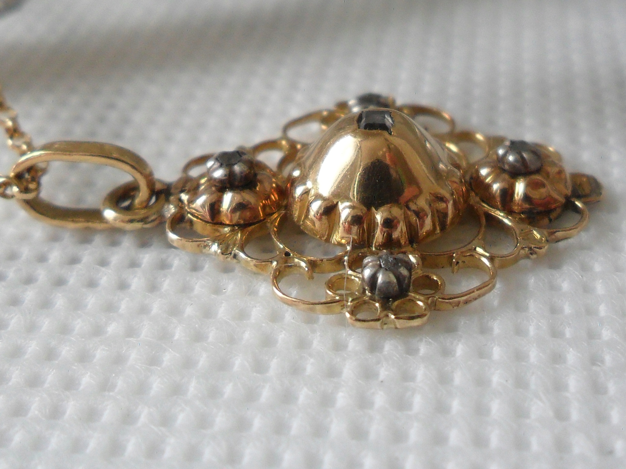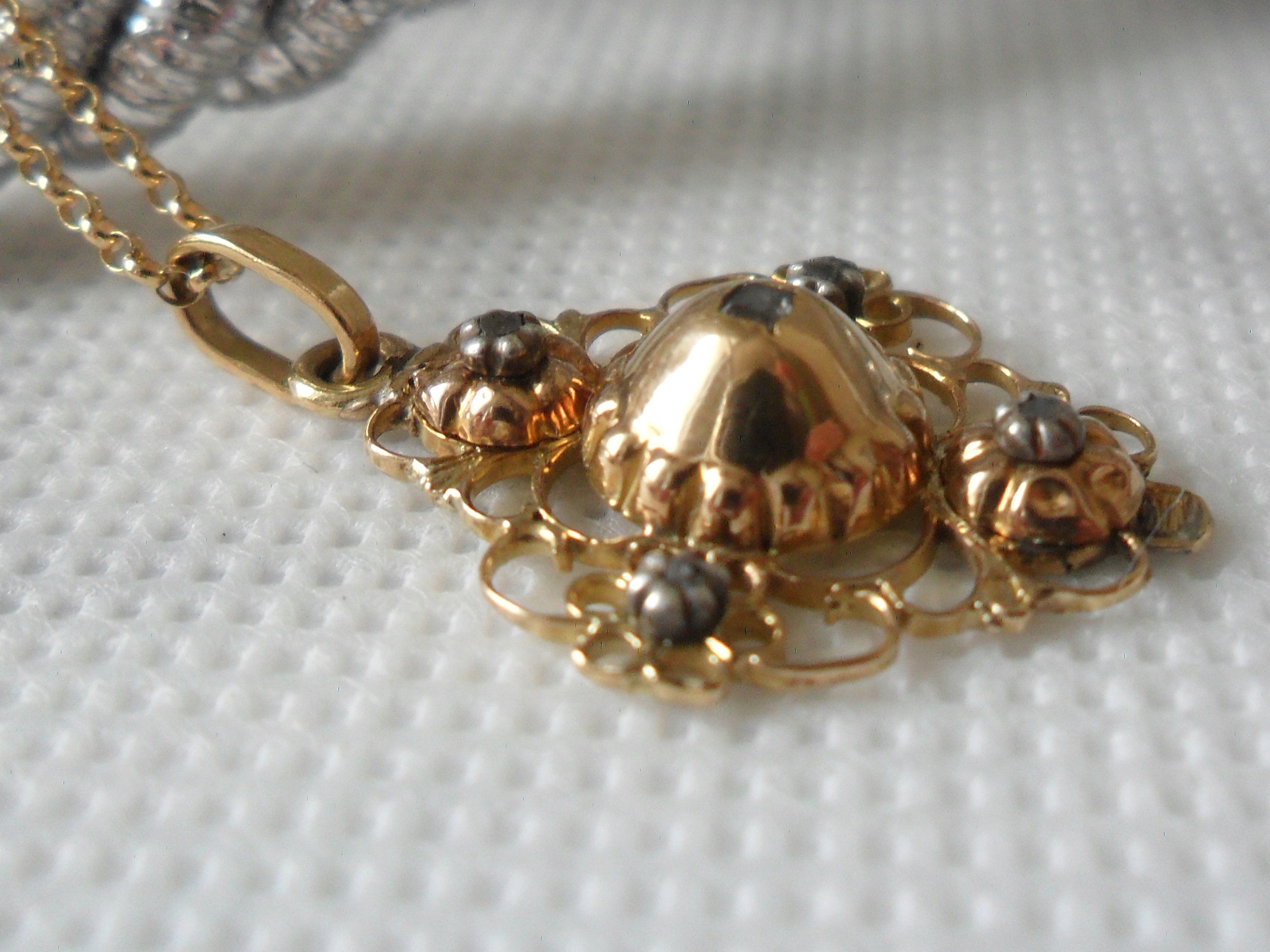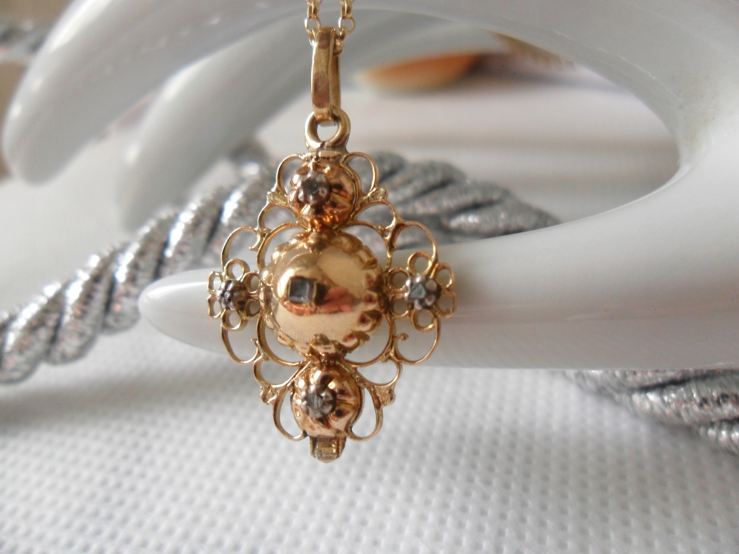 Підвіска в стилі бароко із золота та срібла 750 проби (діамантова оправа). Натуральні алмазні камені в старій огранці встановлені в налаштуваннях, закритих унизу. Розміри підвіски; довжина заміряна до слінгу 2,3 см з слінгом 2,9 см. Максимальна ширина 1,85 см. Висота 5 мм. Вага 2 грами. Аукціон не включає ланцюг. Стан як на фото.