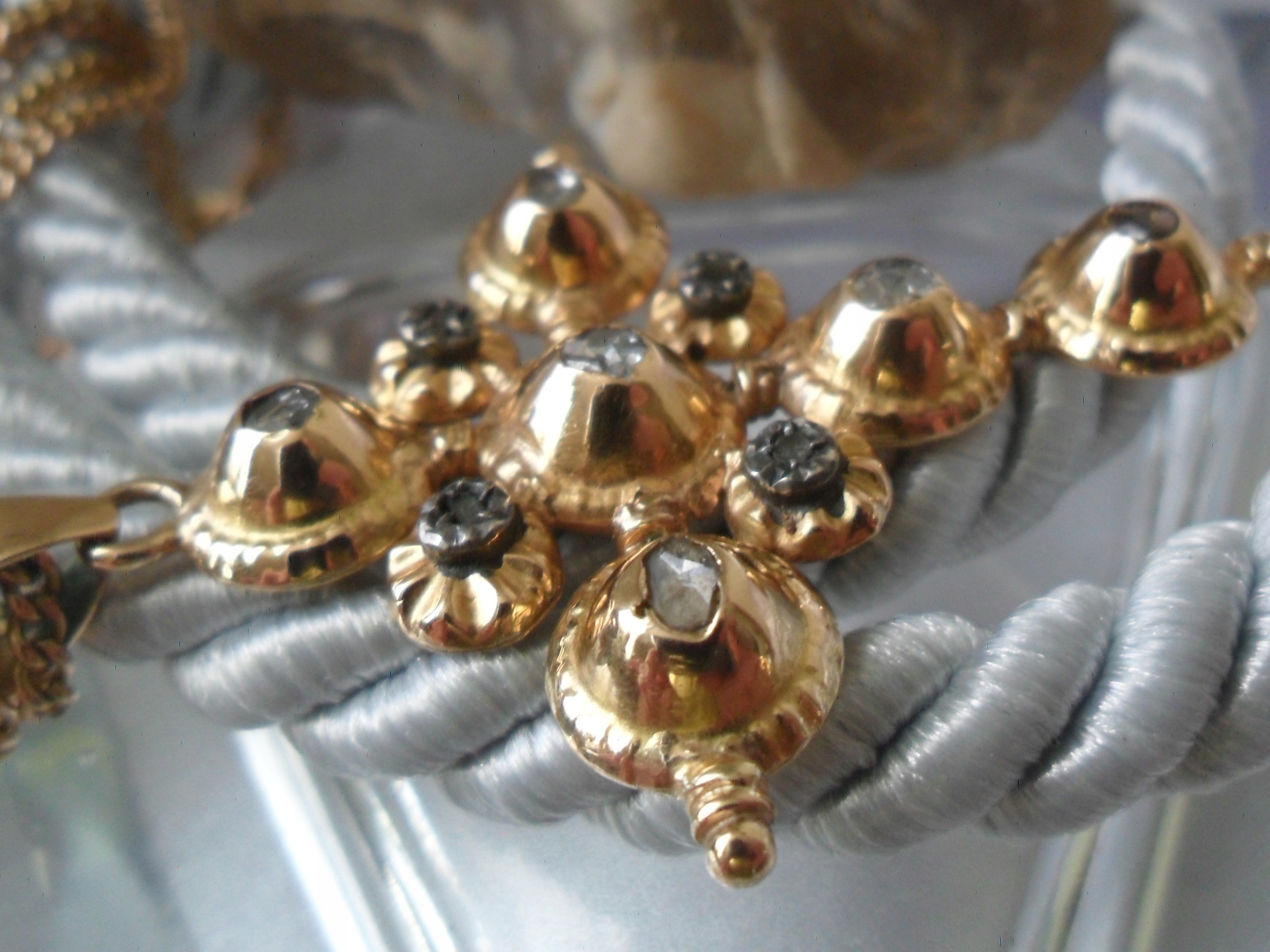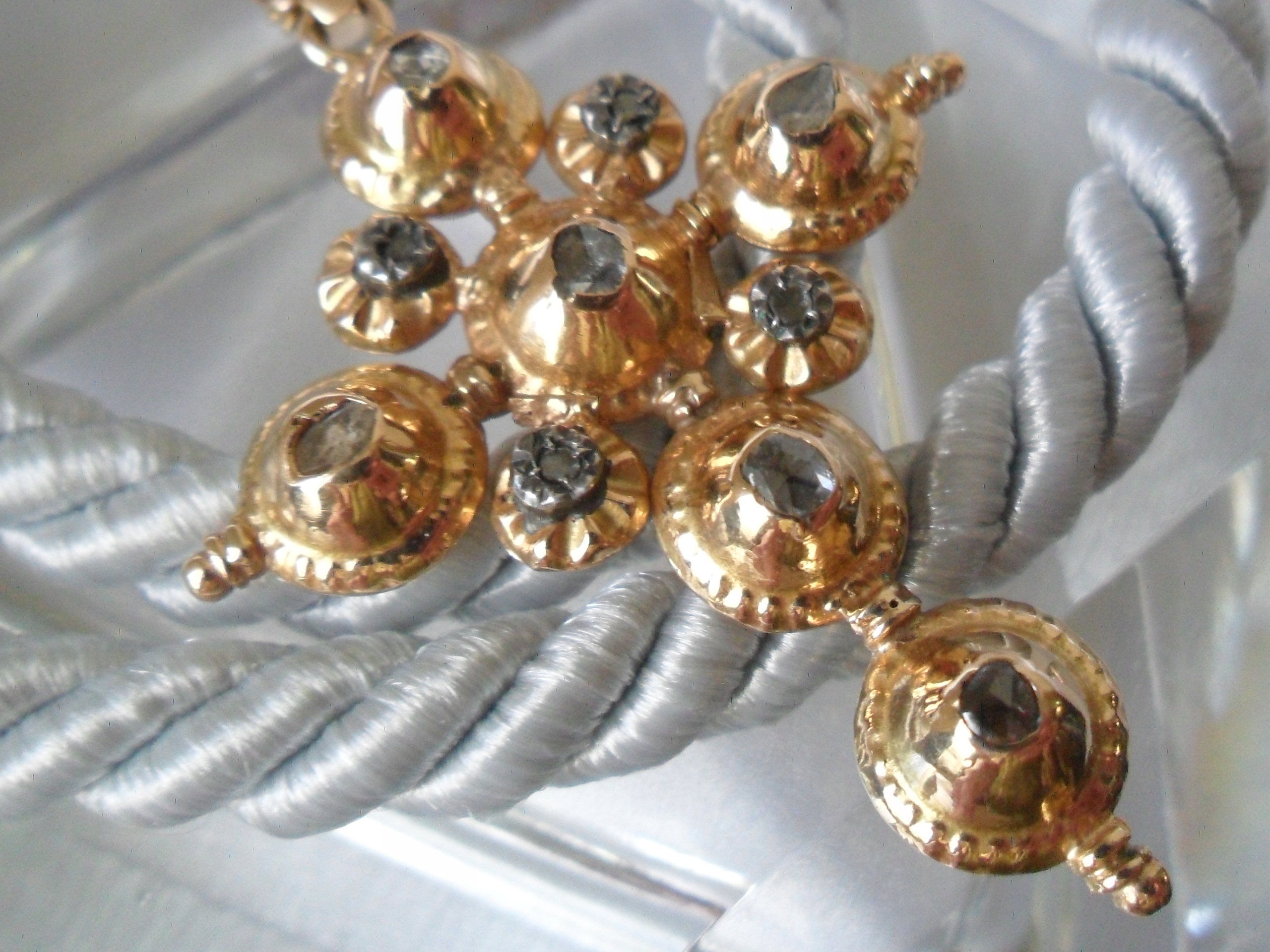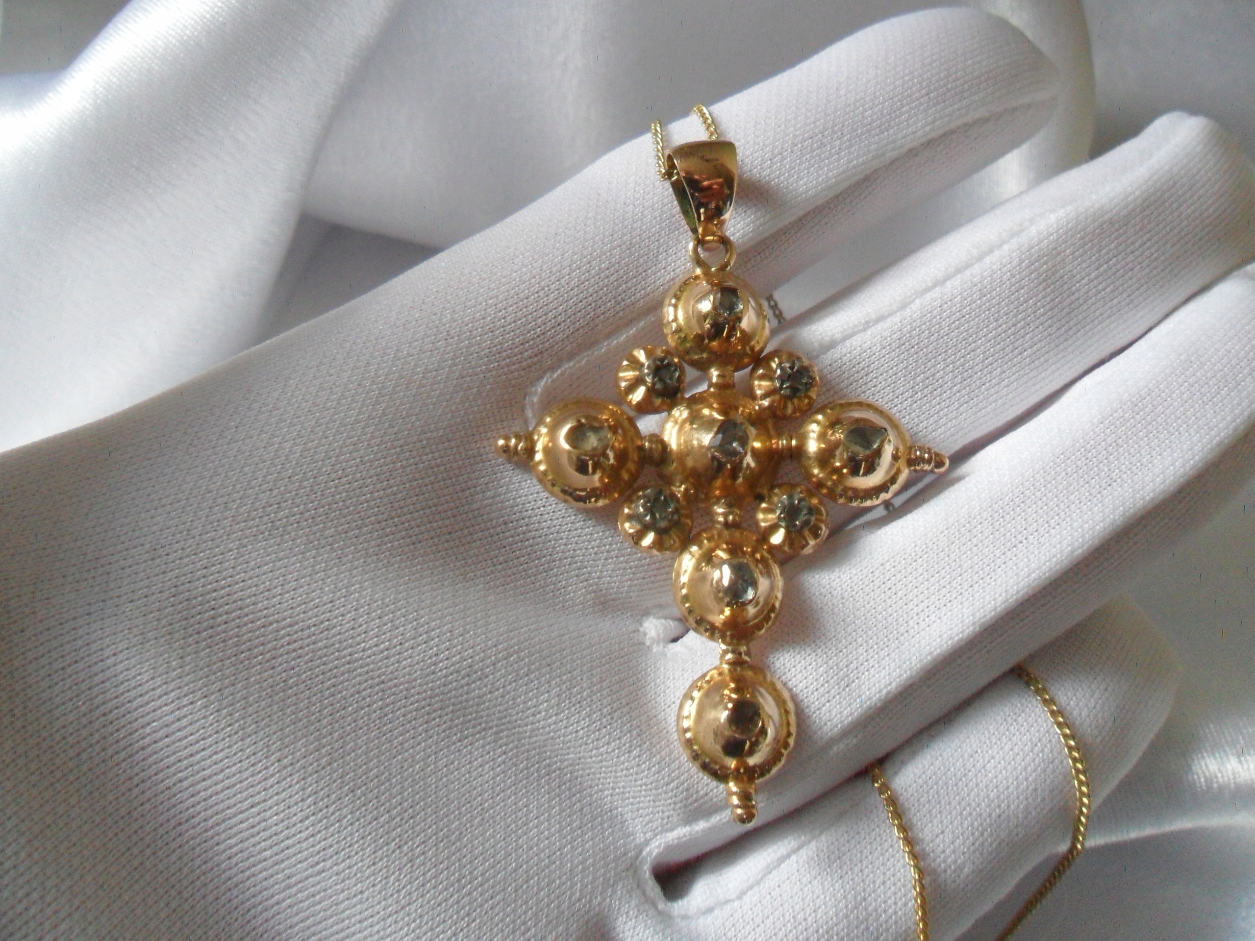 Чудовий хрест із золота 750 проби (чотири центральні діаманти, оправлені сріблом). Прикраса - діаманти в старій нерегулярній огранці, вагою прибл. приблизно 1,4 карата в оправі, закритій знизу. Purity P Колір: світло-сірий. Розміри: 5,1 см х 3,9 см. Товщина 6 мм. Довжина зі слінгом 5,8 см. Вага 7600 грам. Ланцюжок на аукціоні відсутній. Стан як на фото.