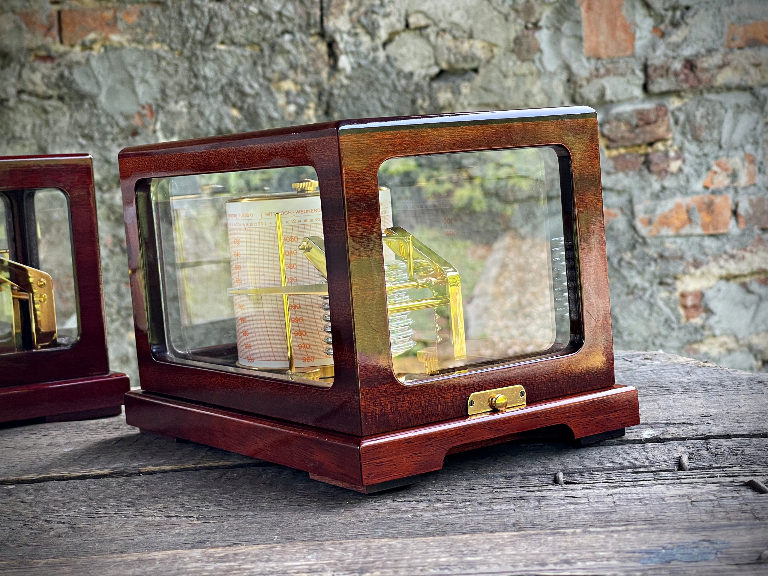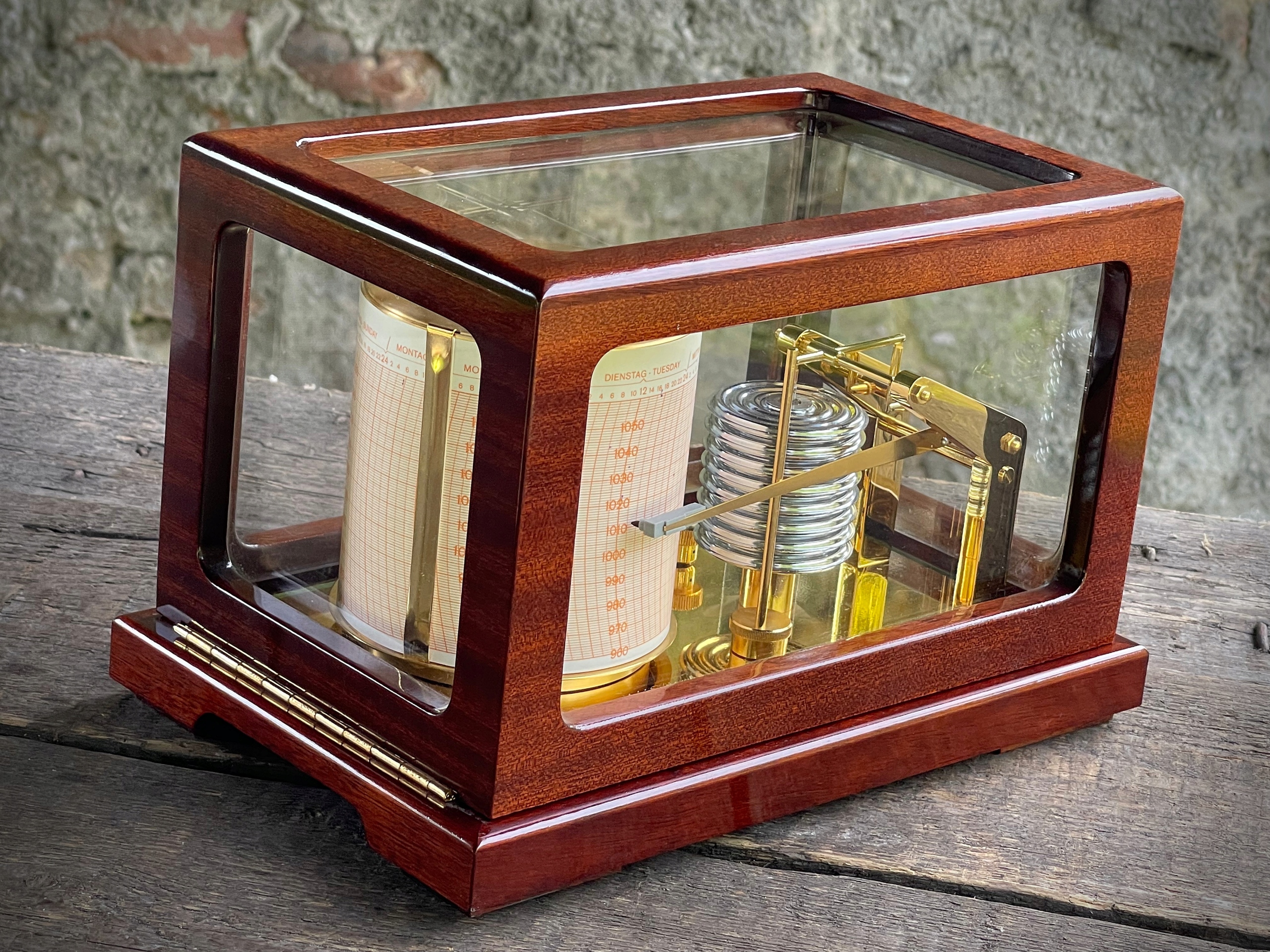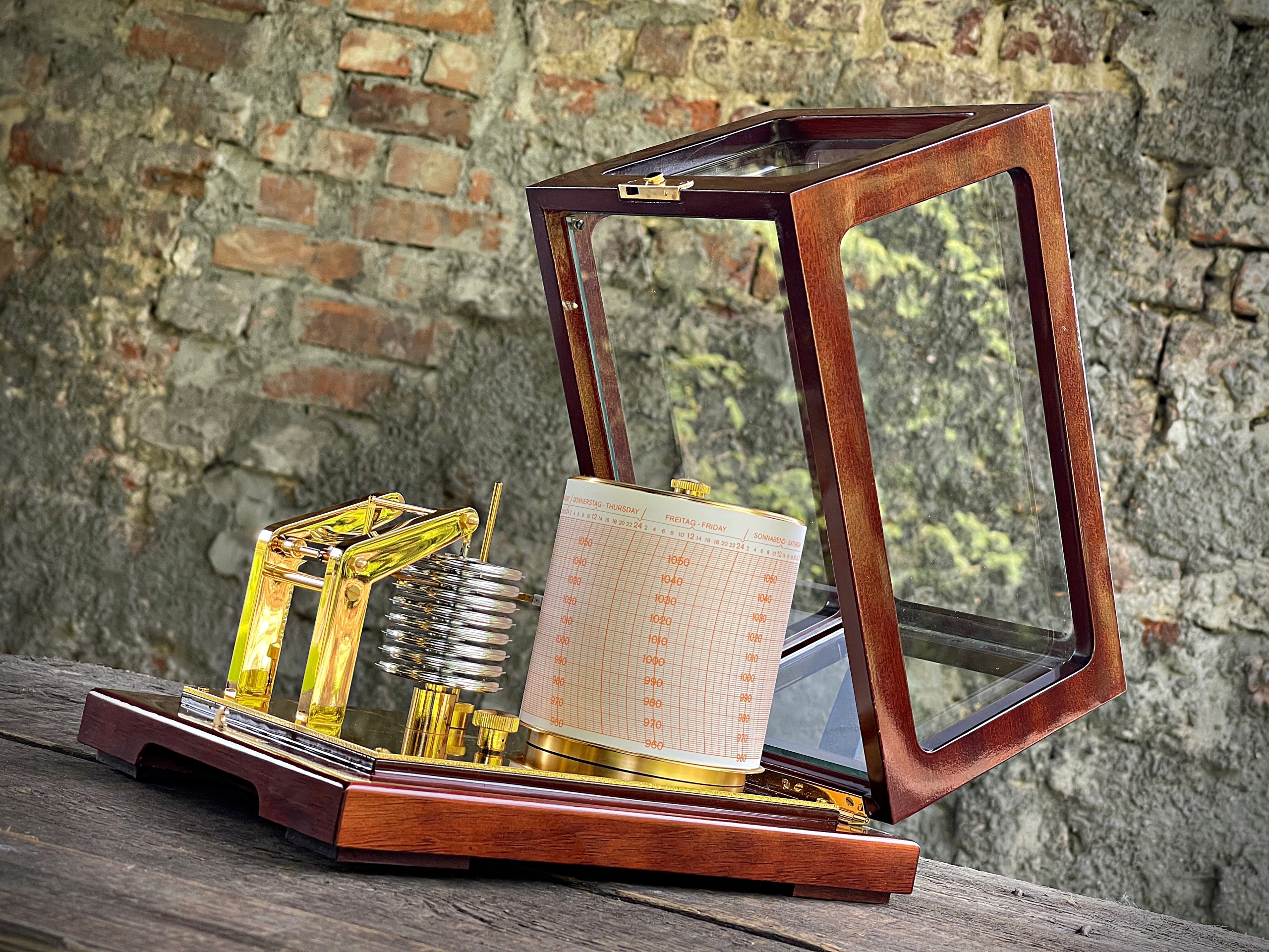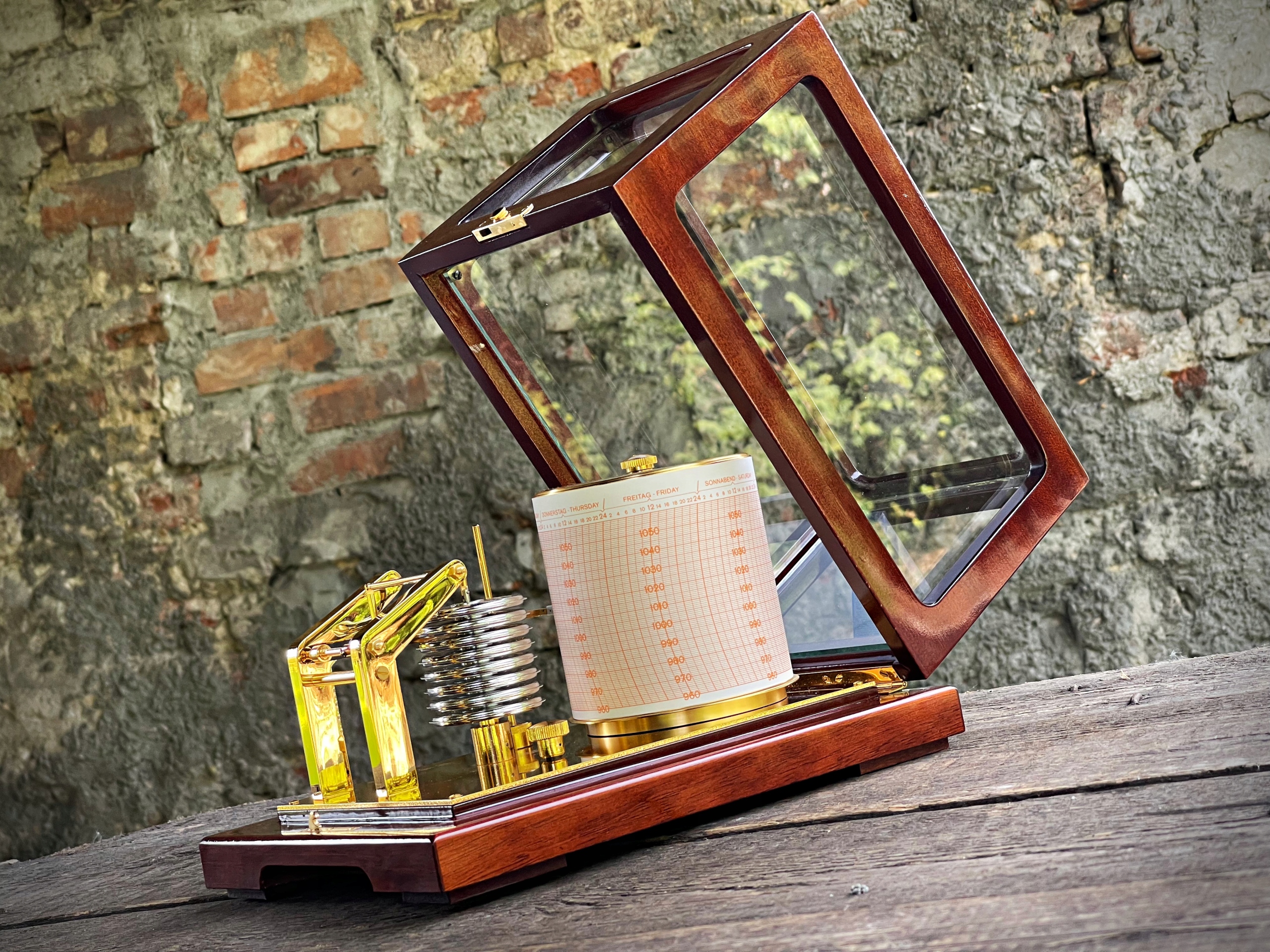 барограф, "Wempe", фіксує зміну атмосферного тиску в режимі реального часу і зберігає їх на спеціальній паперовій стрічці, масштабній гектотопаскосах і розміщується на обертовому барабані, керованому керованим кварцовим годинником і рухається відповідно до руху за годинниковою стрілкою. Повне обертання барабана триває сім днів. Дуже чутливий механізм, оснащений вісім мембран, що робить його дуже точним і надійним і викликає негайну реакцію на зміну атмосферного тиску та служить для прогнозування та прогнозування дощів та сонячних днів. Корпус пристрою з розмірами 265 х 170 х 175 мм, виготовленим з червоного дерева та високоглосним лакованим та механізмом, виготовленим із латуні з золотом, і всі з вагою 3,1 кг. Дуже декоративний барометр викликає захоплення, інтерес, безумовно, буде ідеальним доповненням до будь -якого розташування інтер'єру до барографа, буде прикріплений до набору паперових реєстраційних карт (ви можете фотокопію) запасний стилус та акумулятор. Детальна специфікація: