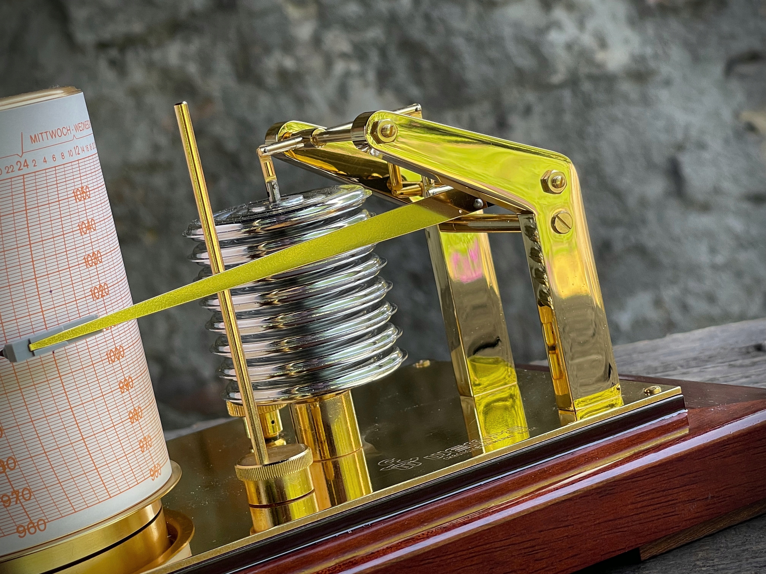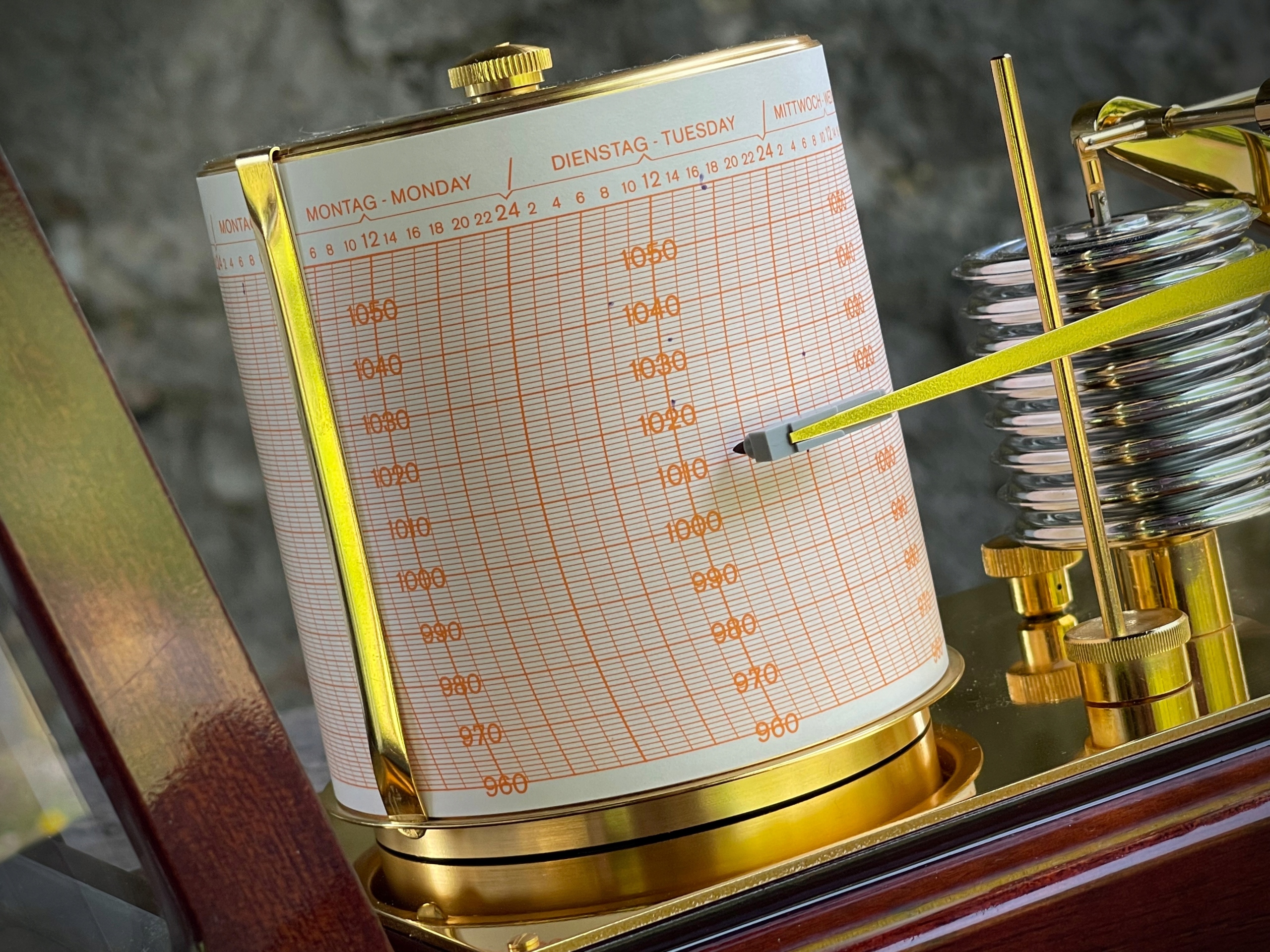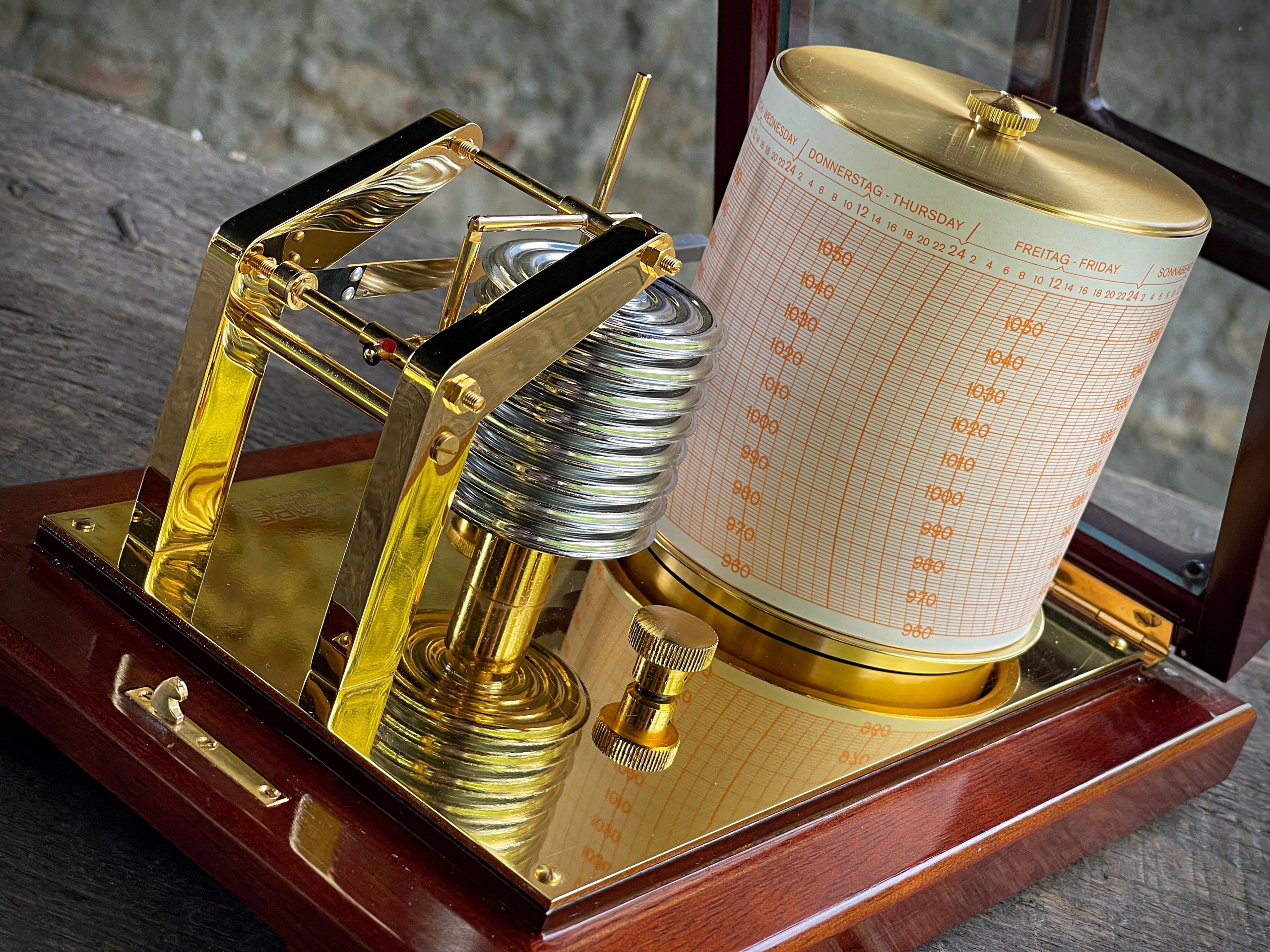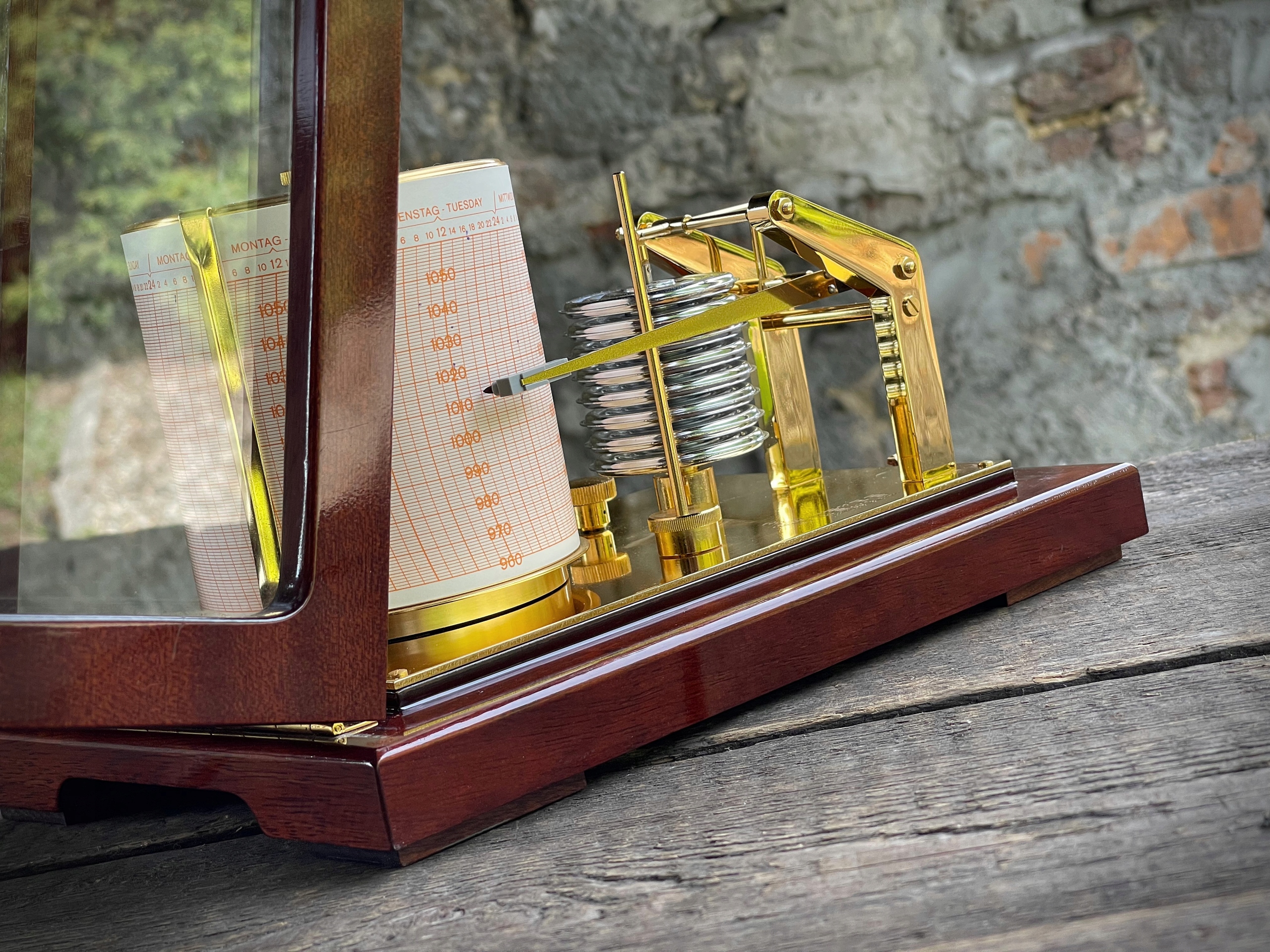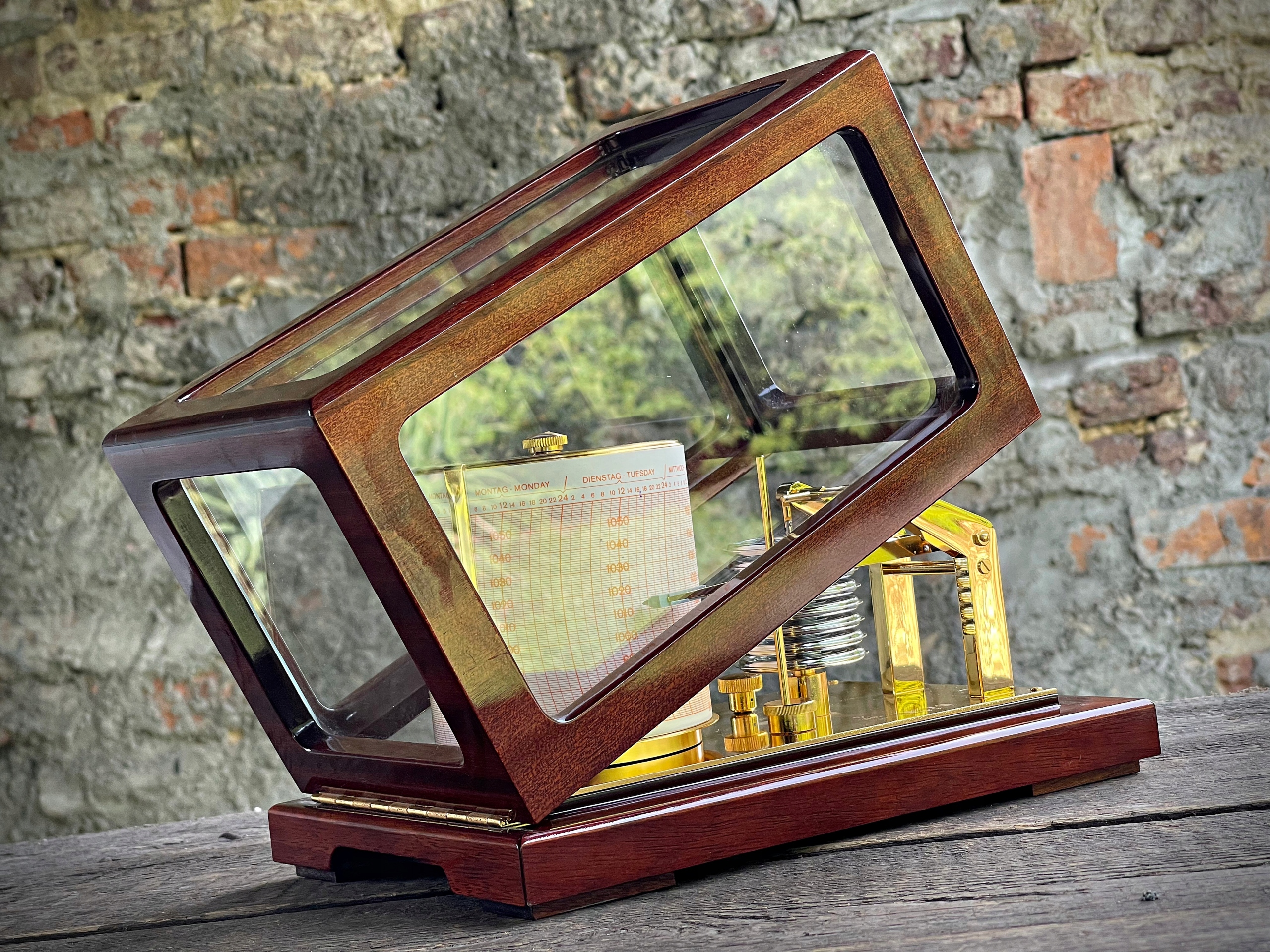 барограф, "Wempe", фіксує зміну атмосферного тиску в режимі реального часу і зберігає їх на спеціальній паперовій стрічці, масштабній гектотопаскосах і розміщується на обертовому барабані, керованому керованим кварцовим годинником і рухається відповідно до руху за годинниковою стрілкою. Повне обертання барабана триває сім днів. Дуже чутливий механізм, оснащений вісім мембран, що робить його дуже точним і надійним і викликає негайну реакцію на зміну атмосферного тиску та служить для прогнозування та прогнозування дощів та сонячних днів. Корпус пристрою з розмірами 265 х 170 х 175 мм, виготовленим з червоного дерева та високоглосним лакованим та механізмом, виготовленим із латуні з золотом, і всі з вагою 3,1 кг. Дуже декоративний барометр викликає захоплення, інтерес, безумовно, буде ідеальним доповненням до будь -якого розташування інтер'єру до барографа, буде прикріплений до набору паперових реєстраційних карт (ви можете фотокопію) запасний стилус та акумулятор. Детальна специфікація: