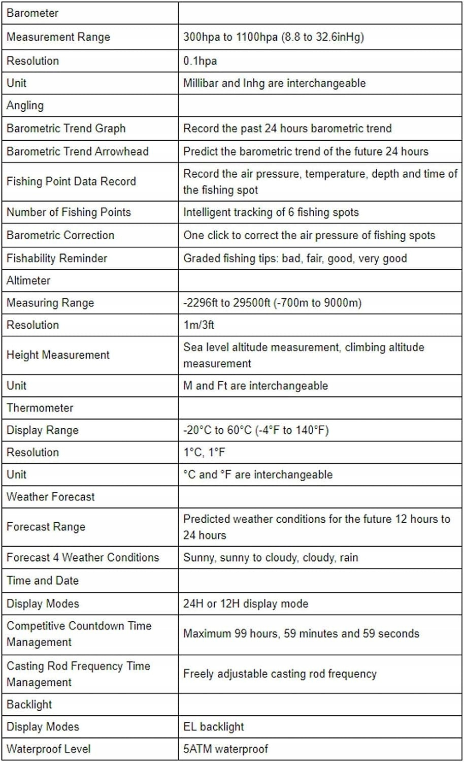 Водонепроникний годинник з барометром виготовлено з високоякісного водонепроникного та дощозахисного матеріалу, міцного та міцного, який легко пошкодити. Багатофункціональний Цей рибальський годинник має багато функцій, таких як погодні умови, зміна атмосферного тиску, інтелектуальне відстеження місць риболовлі тощо. Функція звичайного годинника Включає відображення часу та дати, також можна використовувати як звичайний годинник, зазвичай також можна використовувати як прикрасу. Працює від батареї Годинник з барометром-висотоміром простий і зручний у використанні завдяки живленню від батареї CR2032, яку легко замінити. Застосування Цей годинник має барометр, висотомір, термометр, який є найкращим вибором для риболовлі на відкритому повітрі.