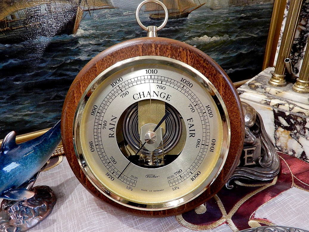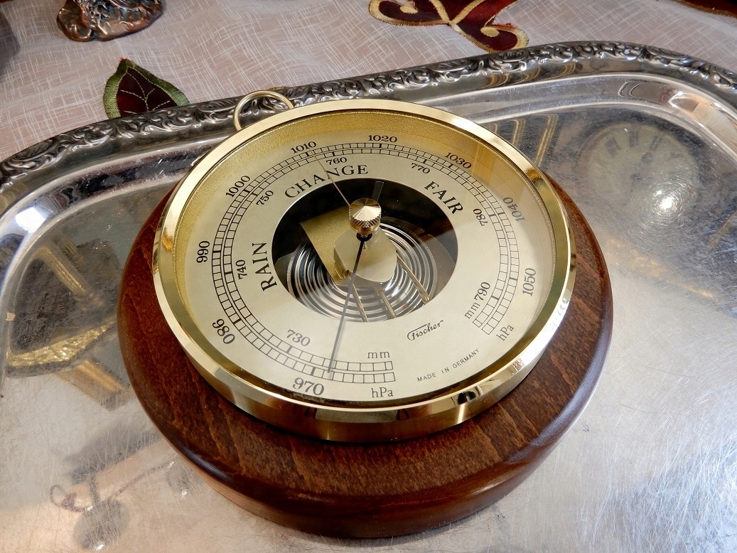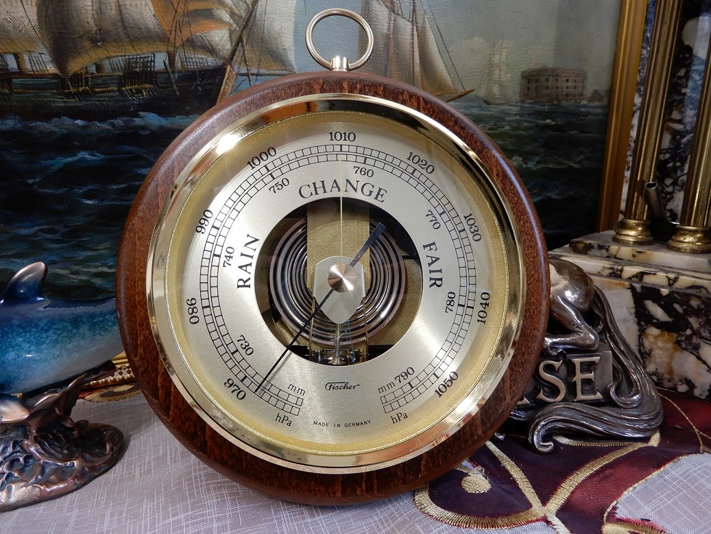 Круговий барометр. Бренд: Fischer, Німеччина. Діаметр 170 мм. Класичний барометр з видимим механізмом. Пристрій монтується в латунну раму. Дерев'яна основа. Назви англійською.