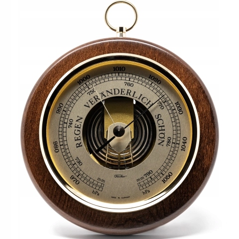 Барометр високого класу з видимим механізмом, встановлений у дерев'яну раму. Барометр - це дуже точний прилад, який вимірює тиск повітря. Для цього використовується так звана вакуумна банка, стінки якої розширюються або звужуються на соті частки міліметра в залежності від зміни тиску повітря. Барометр відкалібровано на заводі.