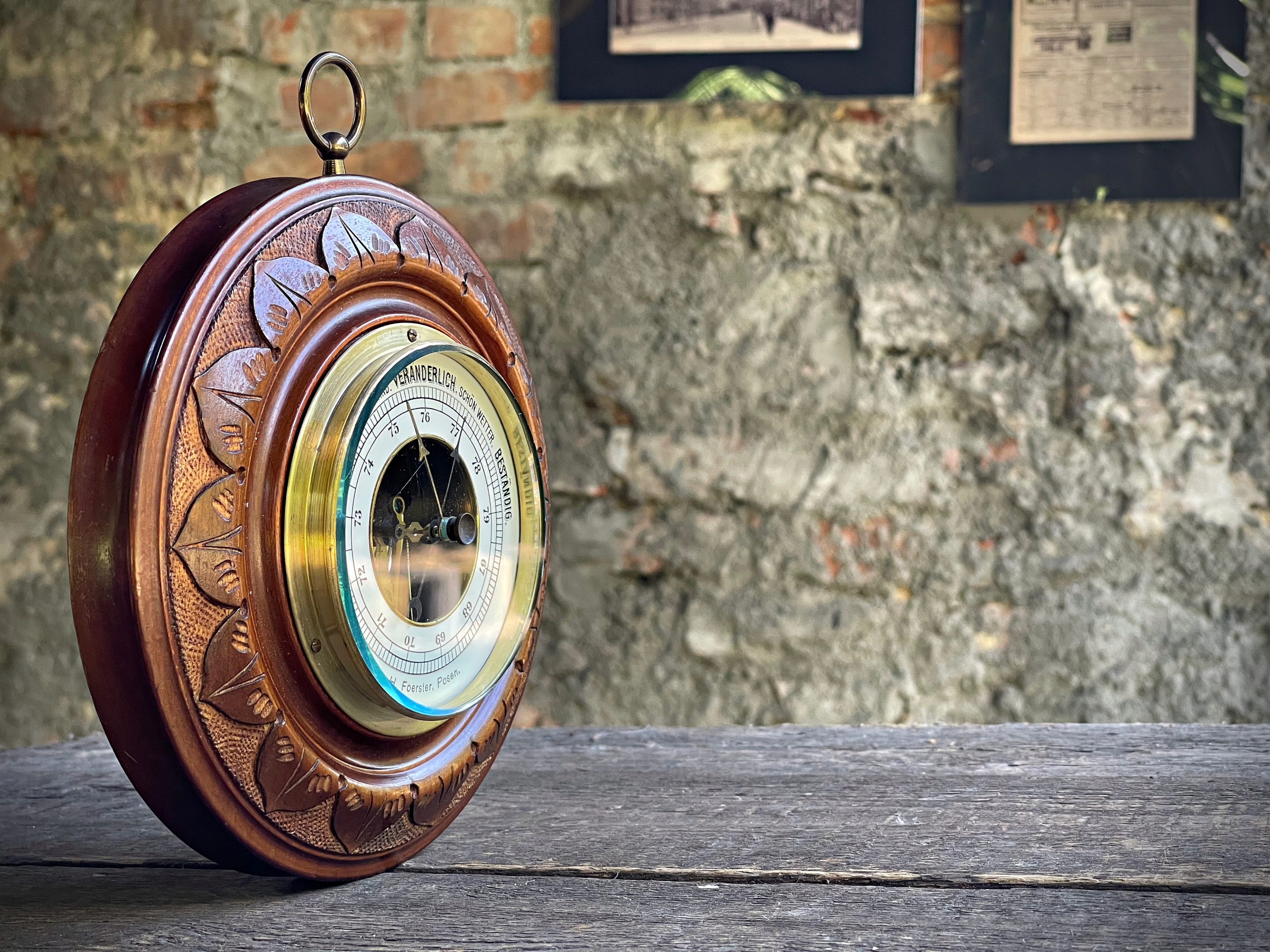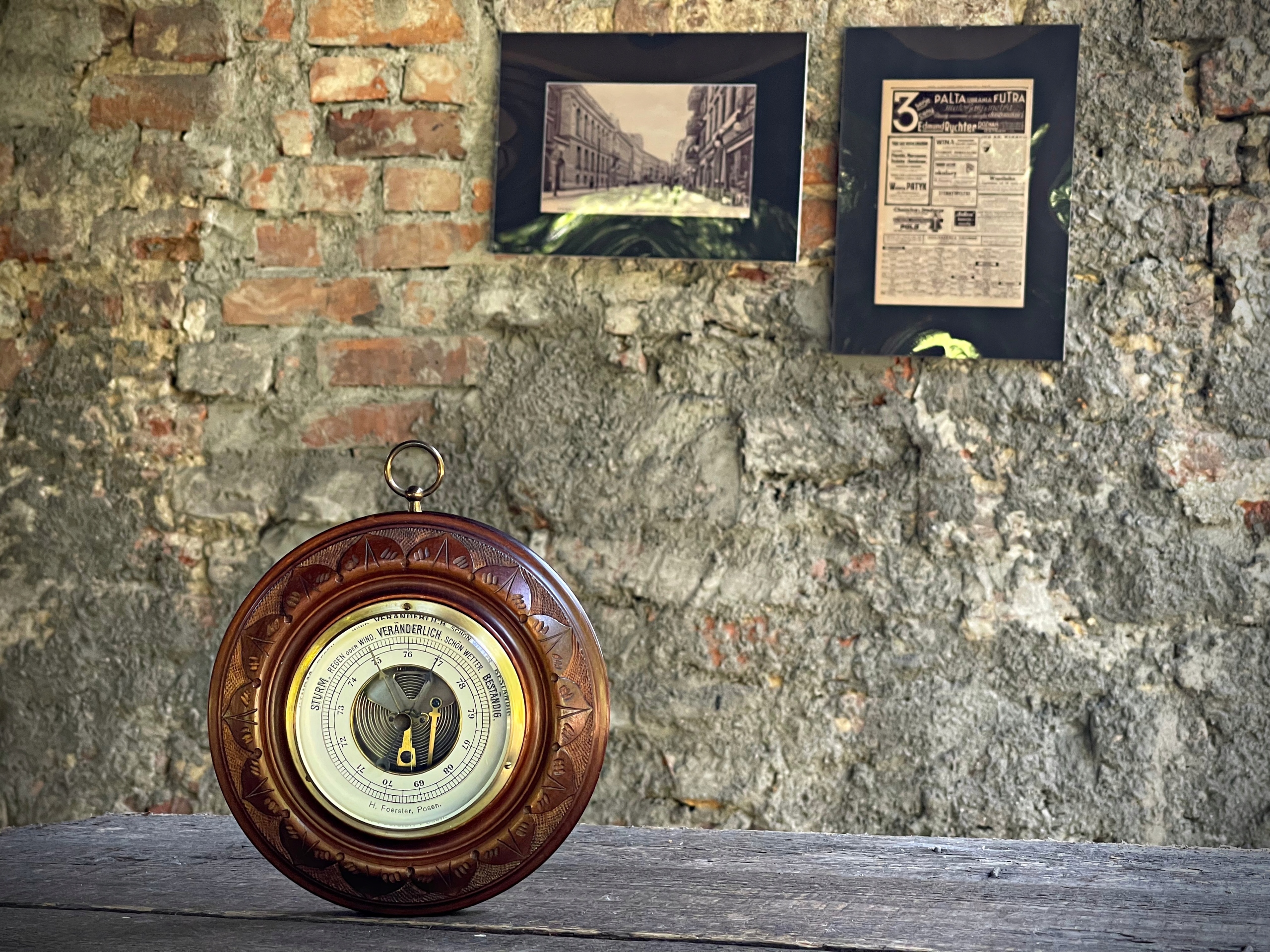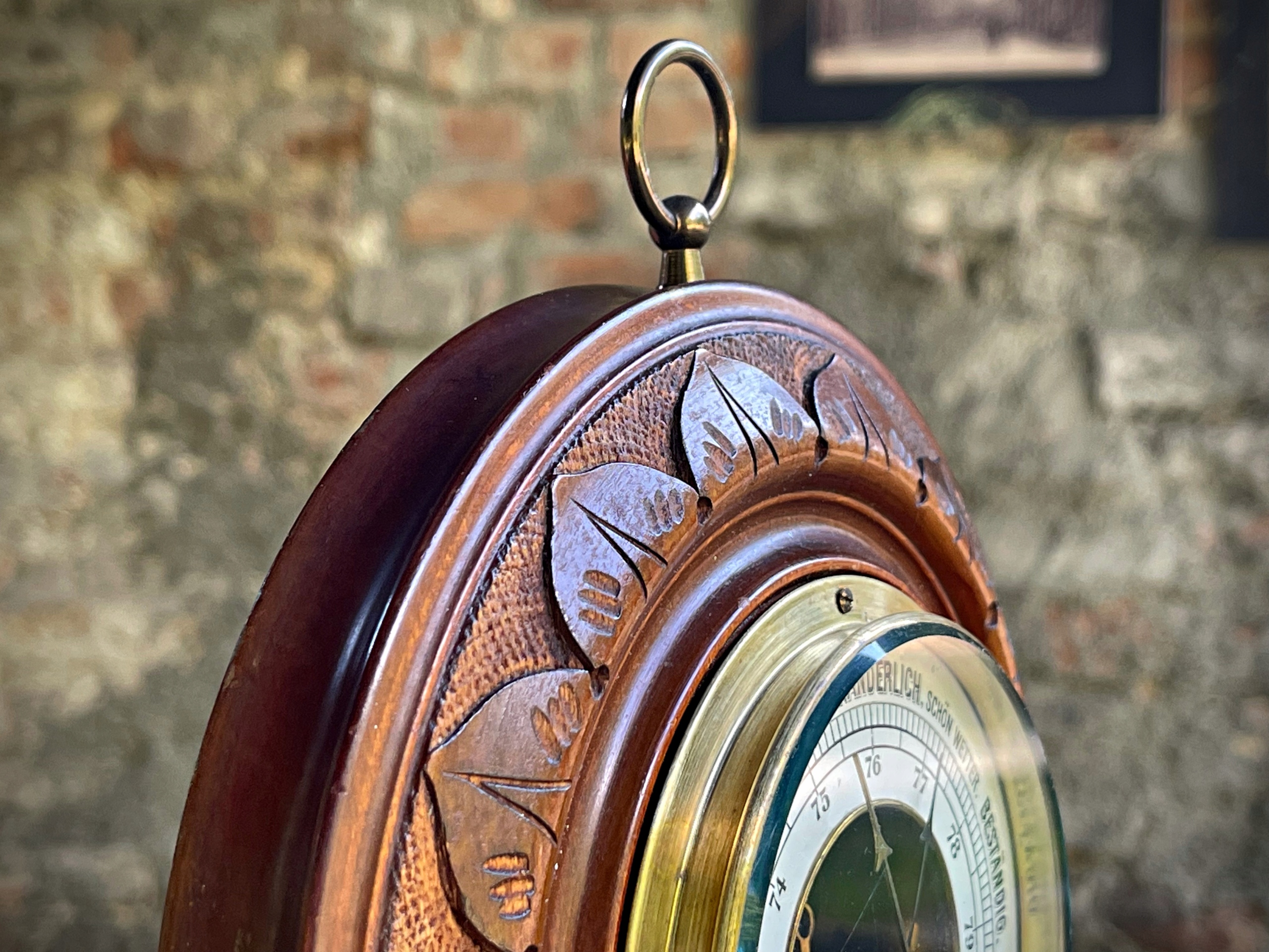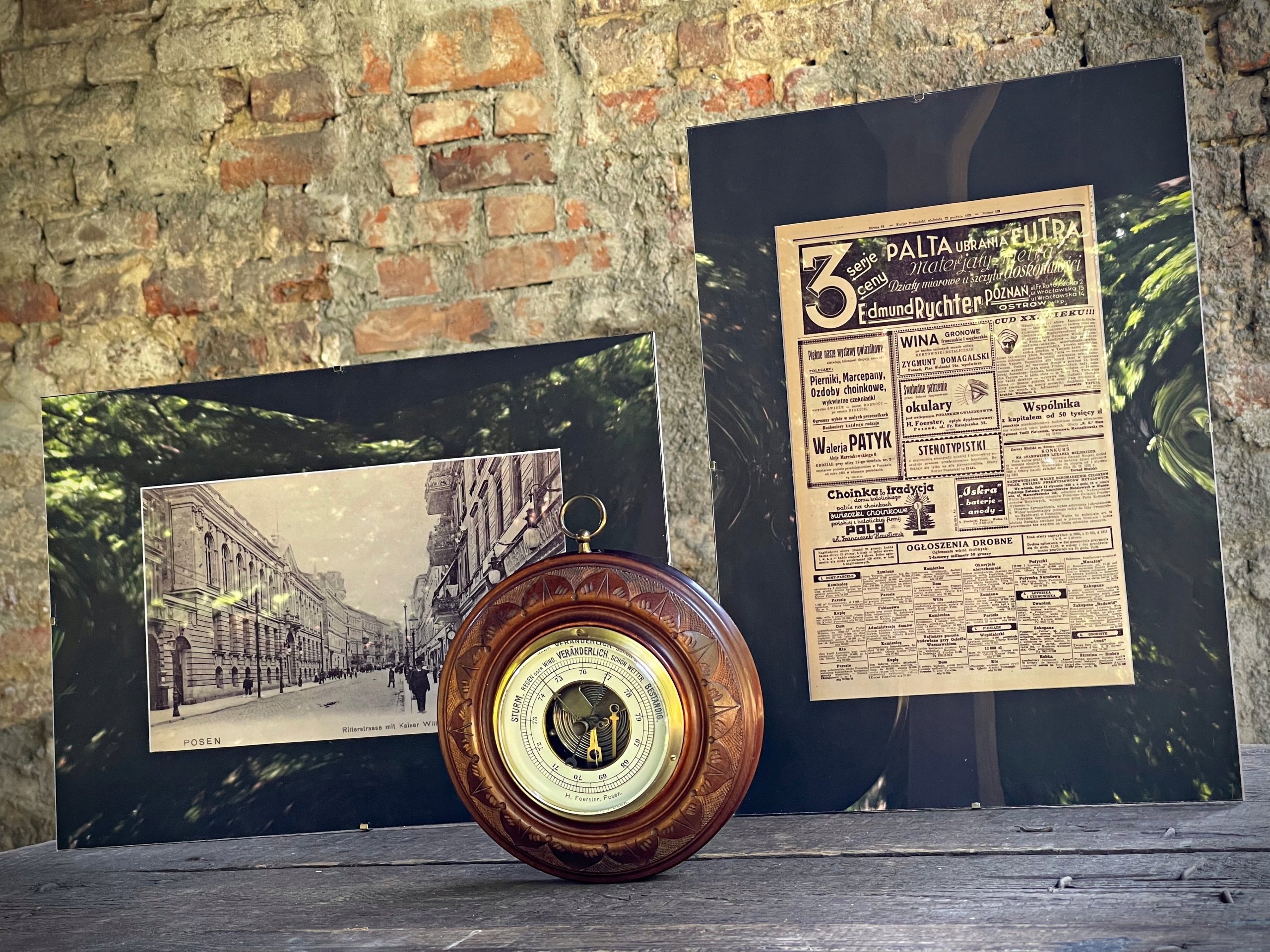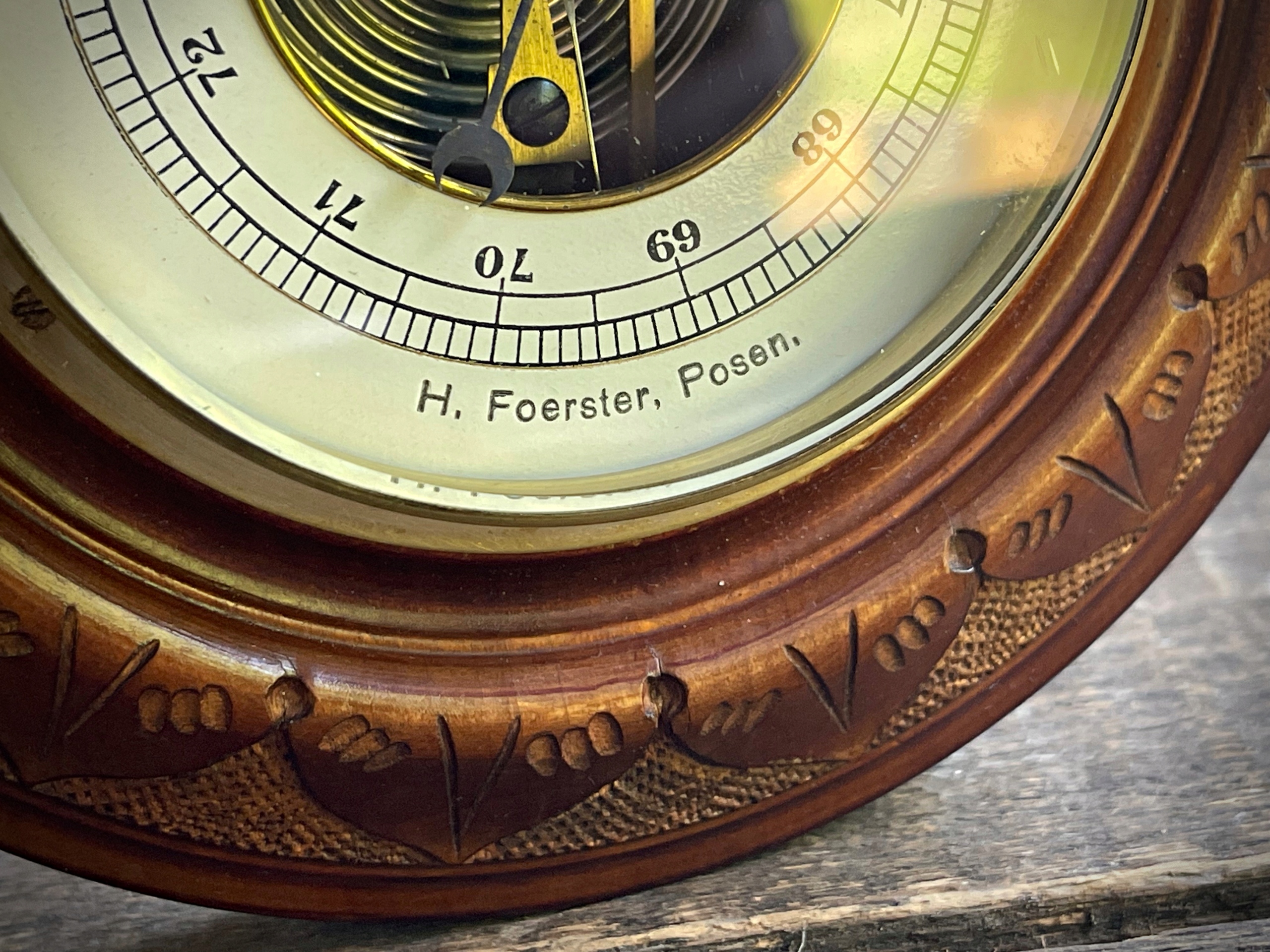 Барометр у дуже багато прикрашеному дерев’яному корпусі, діаметром 17,5 см, підписаний оптичною фабрикою «H. Foerster Posen» з дуже чутливим механізмом, який піддається впливу зареєстрованого та запатентованого шаблону D.R.G.P – Deutsches Reichs Gebrauchs Muster та циферблат, градуйований у міліметрах ртутного стовпа (мм рт.ст.), і все це покрито товстими фасками з боків скло, поміщене в латунну раму. Пристрій походить із міжвоєнного періоду з оптичної фабрики H. Foerster, яка була розташована в Познані на вулиці Ріттерштрассе, 35, а в міжвоєнний період і зараз на вулиці Франциска Ратайчака, 35. Пристрій супроводжується фотографіями (репринтами) з рекламою та видом Ріттерштрассе, де знаходився магазин Х. Фьорстера. Механізм барометра перевірено та відкалібровано в годинникарській майстерні, а корпус покритий воском, зберігаючи оригінал. Барометр з дуже багатою історією стане чудовим доповненням до багатьох офісів чи квартир і принадою для любителів Познані. Можливість відмови від договору протягом 14 днів.