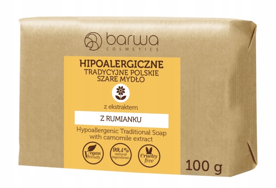 Традиційне польське сіре мило з екстрактом ромашки призначене для чутливої та подразненої шкіри.