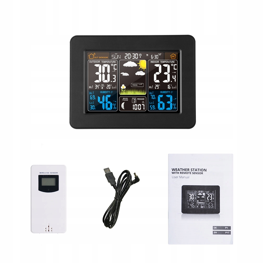 1. Прогноз погоди: температура та волога поза/ зовнішні з чітким великим цифровим дисплеєм. Прогноз погоди, обчислений на основі тиску повітря із зовнішнім бездротовим дистанційним датчиком (діапазон до 200 футів).