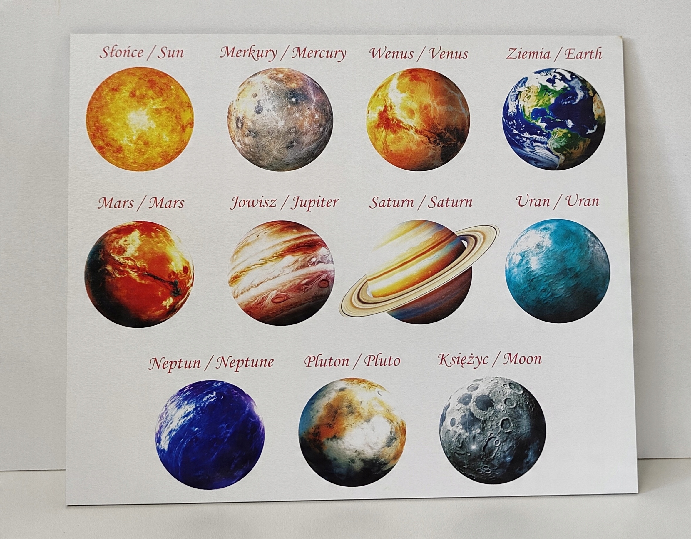 Дошка з чітко надрукованими планетами допоможе вашій дитина дізнається, як дані виглядають як планети і як вони називаються польською та англійською.