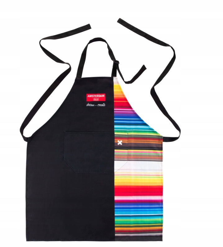 Одягається через голову та зав'язується ззаду. Регулювання лямки фартуха на шиї за допомогою пряжки дозволяє підганяти його під різні силуети. Фартух з різнокольоровими смугами з логотипом бренду Amsterdam і написом Dream x Create. Його можна прати в пральній машині.