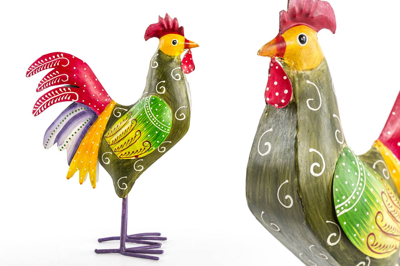 декоративний півень для поставки. Виготовлений з металу та пофарбованого. Чудовий декоративний елемент, прекрасно представлений у домовій та садовій композиції. Це змінить природу кожної весняної домовленості.