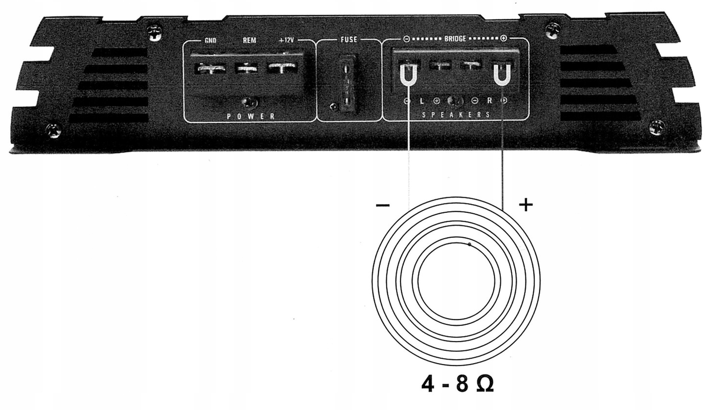 Підсилювач має можливість перемикання, тобто поєднання потужності лівого та правого каналів для живлення одного низькочастотного динаміка. Вбудований кросовер низьких частот дозволяє правильно налаштувати частотну характеристику, щоб сабвуфер отримував звук із відповідною частотною характеристикою.