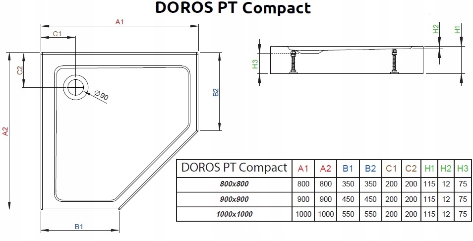 П'ятикутний душовий піддон Radaway DOROS PT COMPACT 800x800x115 SDRPT8080-05