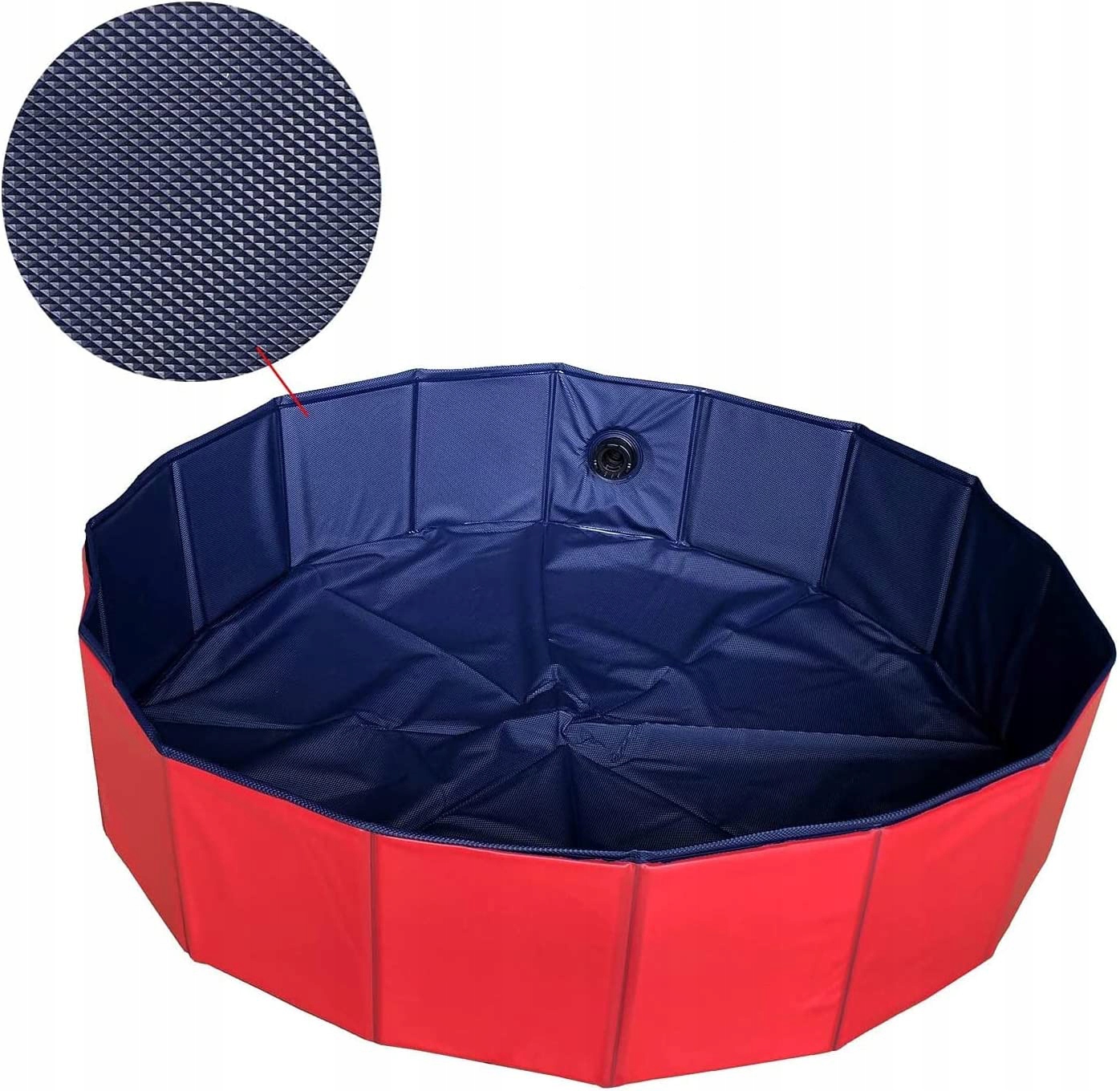Розміри басейну Ø80 x висота 20 см, укріплені краї та клапан для легкого спорожнення. Шпильки знизу зменшують ризик того, що собака послизнеться. Ємність: 260 л.