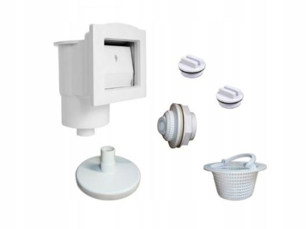 З вхідним соплом і перехідником для підключення кисті. Скімер, підключений до фільтрації, призначений для збору води з басейну та передачі її далі, а кошик, розміщений у ньому, збирає більші домішки, такі як листя. У стандартний комплект входять: набір наконечників 32/38 мм для насадки і скіммера, зворотна насадка в басейн, перехідник для підключення пилососа, заслінка, передсито і заглушки для утеплення.