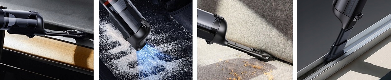 A5 Air — це універсальний пилосос, який можна використовувати в різних сценаріях завдяки насадкам, що входять у комплект. Ви можете легко пропилососити вентиляційні решітки, підлогові килимки чи віконні рейки за допомогою відповідного наконечника. Крім того, пилосос оснащений спеціальним наконечником для видалення повітря з вакуумних пакетів, матраців, що полегшує зберігання речей.