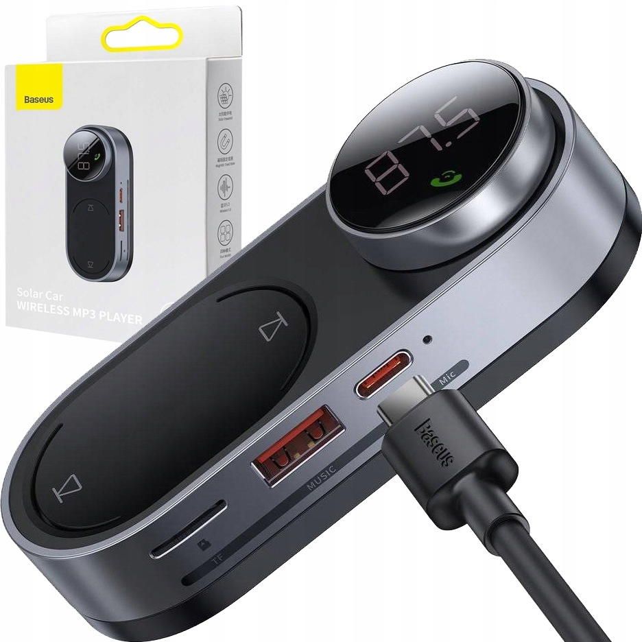 FM Baseus CDMP000001 Передавач - це інноваційний пристрій, який дозволяє бездротово грати музику та мати телефонні дзвінки в машині. Завдяки вбудованій сонячній панелі та акумуляторі 700 мАг, пристрій може бути заряджений як сонячною енергією, так і за допомогою кабелю USB-C