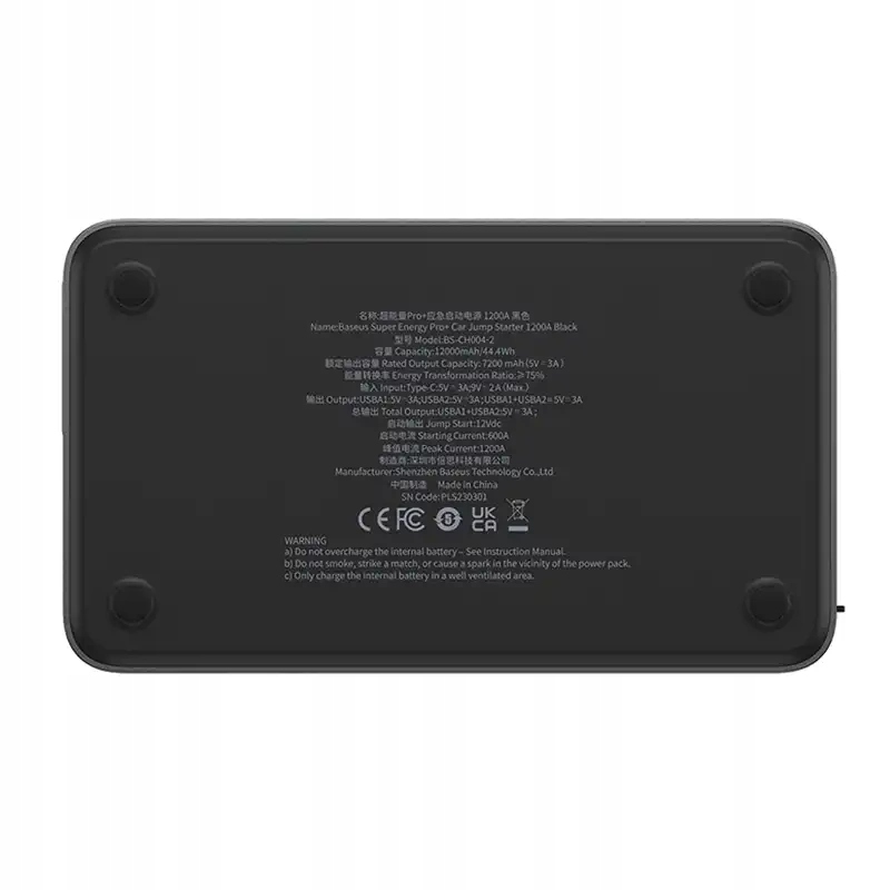 Продюсер Baseus Ім'я Автомобільний пусковий пристрій Super Energy Pro+ 1200A Модель C00245700111-00 Колір чорний Ємність акумулятора 12000 мАг / 44,4 Втч Номінальна вихідна потужність 7200 мАг (5 В – 3 А) Вхід USB-C: 5 В – 3 A (макс.), 9 В – 2 A (макс.) Вихід USB-A1: 5 В – 3 А;