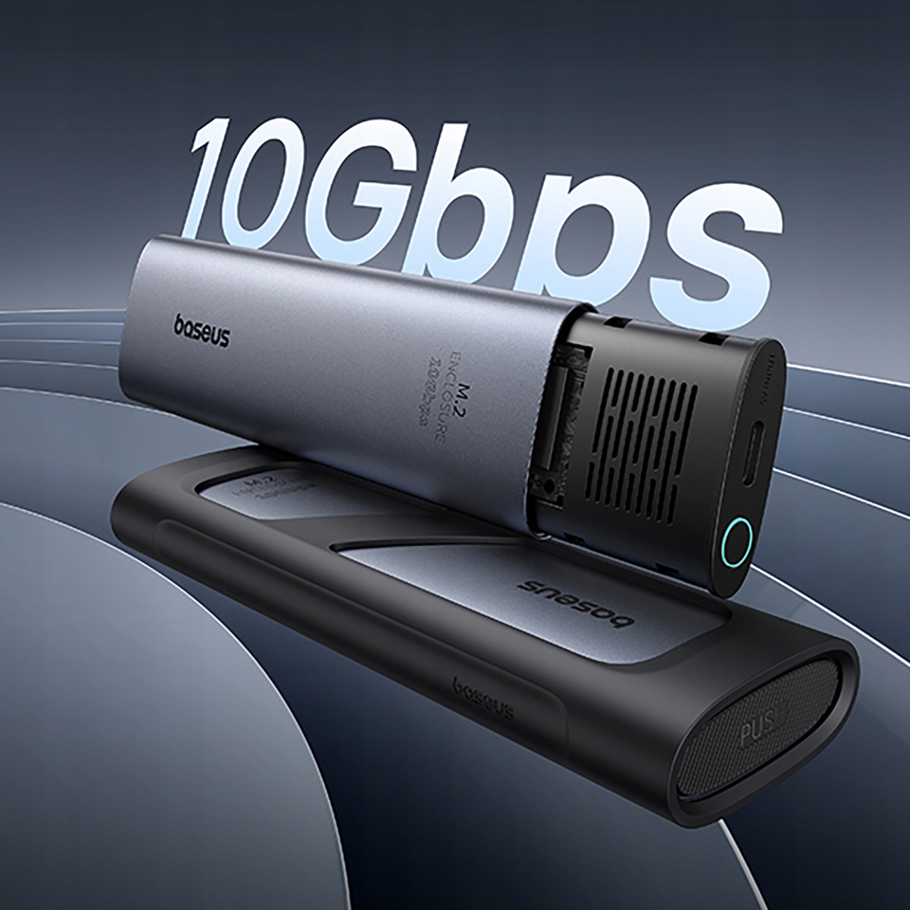 Завдяки порту USB3.2 Gen 2 і швидкості передачі до 10 Гбіт/с відсік для твердотільних накопичувачів Baseus FlyJoy забезпечує швидке й ефективне передавання даних. У комплект входить кабель USB-C / USB-C, який дозволяє підключати різні пристрої, такі як телефони, планшети, ігрові консолі Steam Deck або ROG Ally. Тож ви можете будь-коли створювати резервні копії своїх фотографій і відео, безперешкодно зберігати HD-відео та легко й швидко завантажувати ігри.