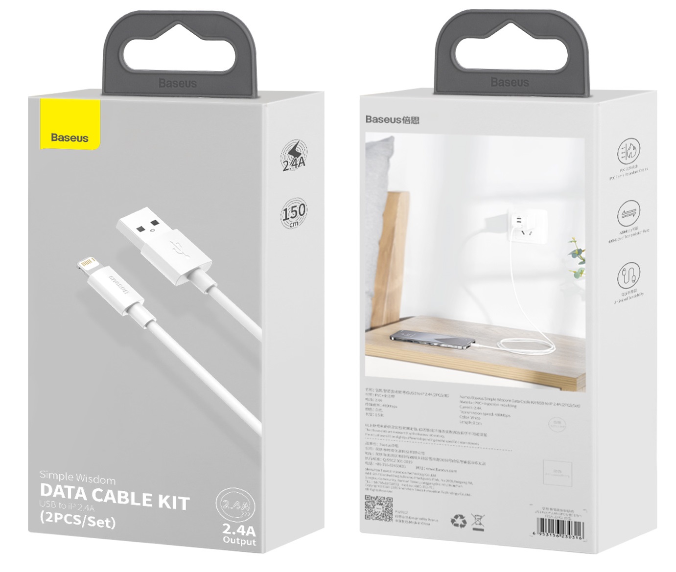 BASEUS STRONG USB CABLE - LIGHTNING FOR IPHONE IPAD CABLE 2.4A 1.5M 2PCS