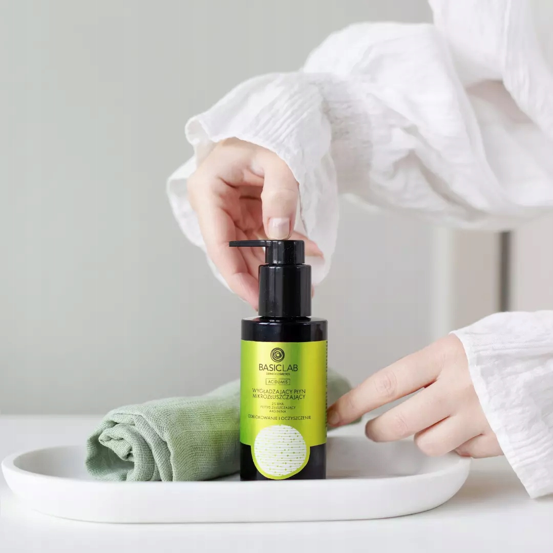 Розгладжуючий мікропілінговий флюїд — це цілорічний м’яко відлущуючий продукт для всіх типів шкіри, особливо схильної до вугрів і вугрів. Ефективно регулює секрецію шкірного сала та очищає отвори сальних залоз (так звані пори), зменшуючи їх видимість. Зменшує наявні утворення вугрів і зменшує схильність до появи нових. Розгладжує структуру та покращує тон шкіри, надаючи їй здорового сяйва.