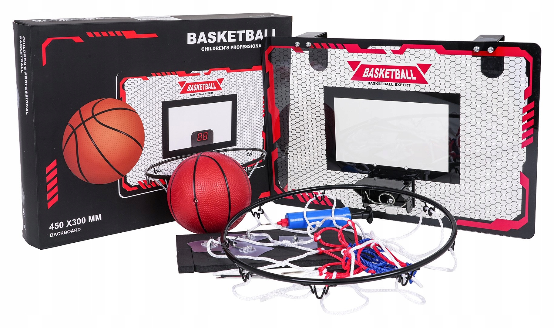 Баскетбольний набір для дітей від трьох років. Збірка набору дуже проста і займає кілька хвилин. Готову дошку можна повісити на двері за допомогою гачків, що входять в комплект, або приклеїти до рівної поверхні стрічками з міцним клеєм і гачками (входять в комплект). Зворотна сторона дошки покрита товстим поролоном, який не дає дошці зміщуватися під час гри та гасить вібрацію під час кидка.