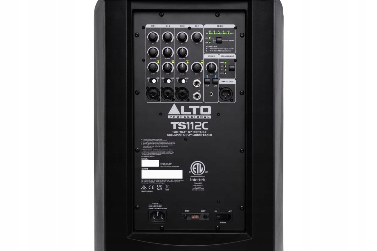 Alto Professional TS112C — це сучасна інтегрована «колонна» акустична система, яка поєднує в собі сабвуфер, підсилювач, процесор DSP і цифровий мікшер. Розроблений з урахуванням мобільних музикантів, ді-джеїв, компаній, що проводять заходи, і малих сцен, TS112C забезпечує вражаючу потужність 1200 Вт і чистий, динамічний звук у компактній формі. Система готова до роботи відразу після розпакування - просто підключіть джерело звуку та насолоджуйтесь професійним звуком.