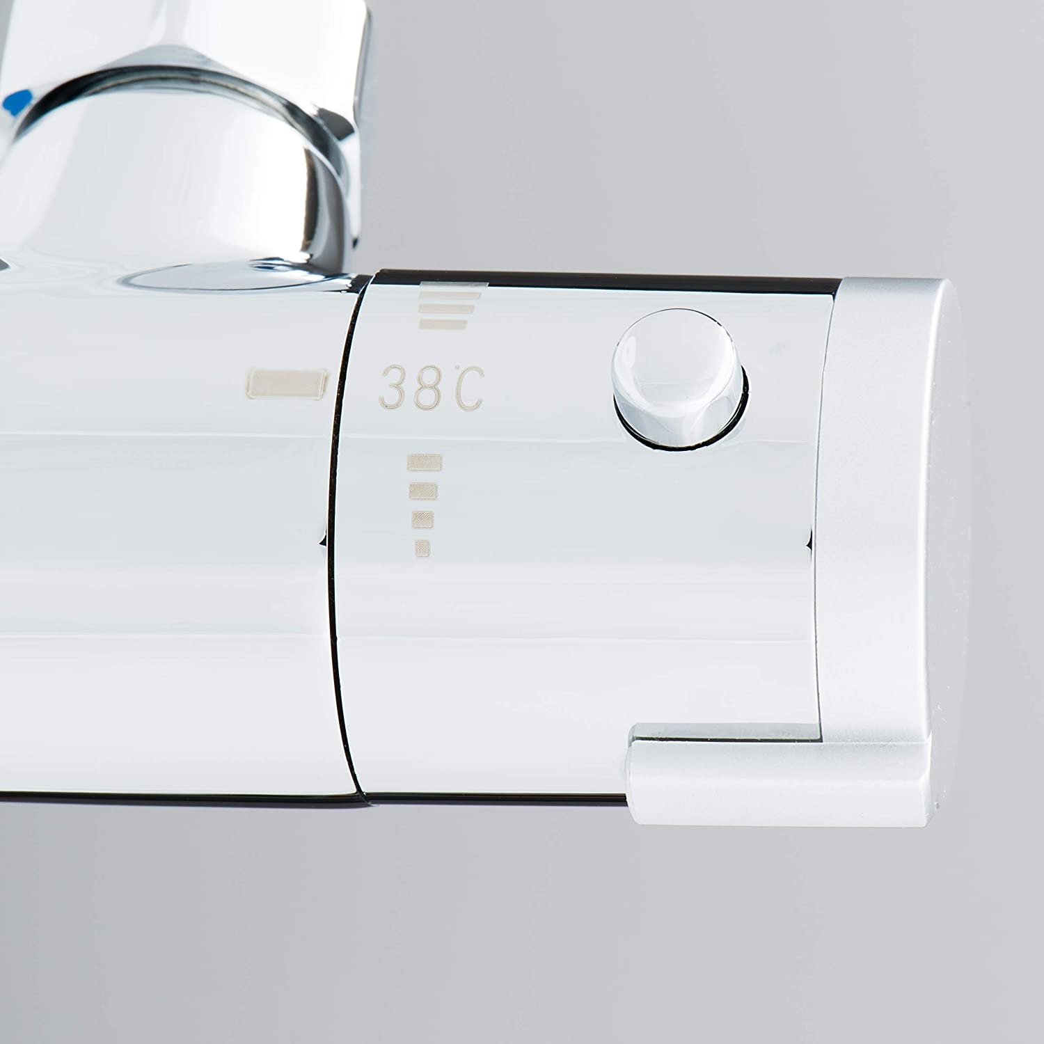Високоякісний хромований термостатичний кран Biotherm зі шкалою температури для рівномірного та комфортного регулювання температури при 38°C мінімізує ризик опіків.