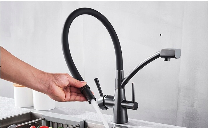 Використання двоконтурного крана (триходові крани) дозволяє підключити фільтр до води без необхідності установки (свердління) окремого крана. В одному крані ми маємо два незалежних контуру, один для холодної та гарячої води, а інший для фільтрованої води. У нашій пропозиції: двоконтурні змішувачі з підключенням фільтра для води, триходові крани з висувним виливом, змішувачі для кухні з можливістю підключення фільтрованої води.