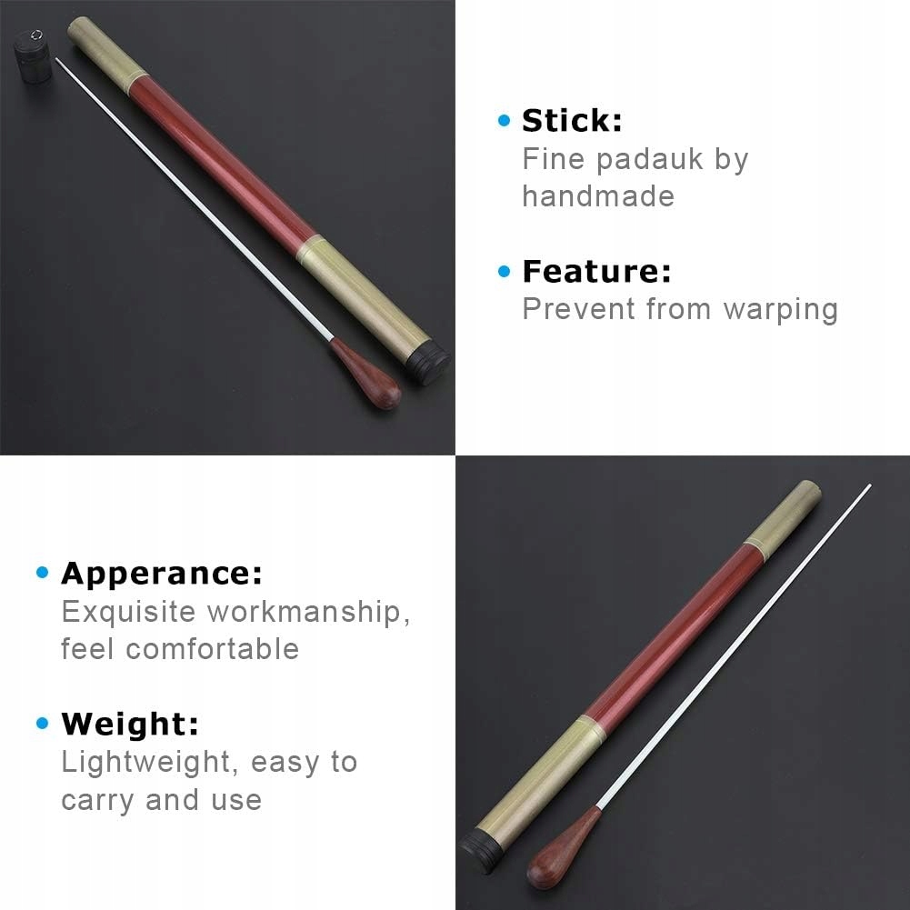 Вишукане виконання, його важко зламати, міцний і зручний. Легкий, простий у транспортуванні та використанні. Палиця виготовлена вручну з ніжного матеріалу padauk, який запобігає коробленню. Помічник диригента сприяє підвищенню концертної майстерності. Послідовний баланс і вага, що є професійним. Чудовий подарунок диригенту оркестру. Підходити для хору, симфонії, оркестру тощо.