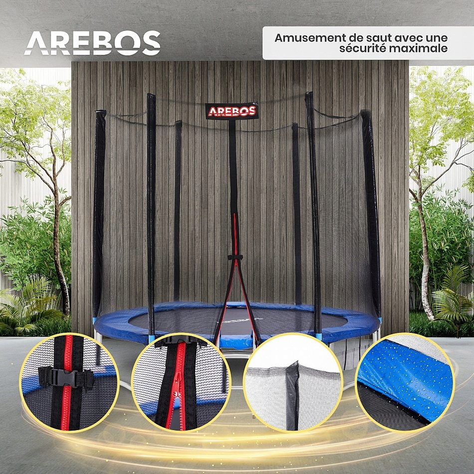 Цей батут від AREBOS — це повний набір, що включає ніжки, килимок для стрибків, пружини, драбинку, захисну сітку, м’який захисний чохол, який покриває контур батута, і кілочки для сітки. Особливу увагу приділено безпеці та довговічності.