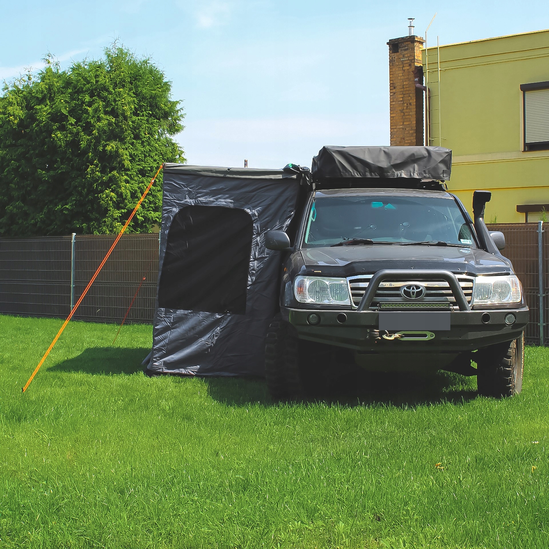 4 Сядка до транспортного засобу дозволяє отримати доступ до транспортного засобу до багажника та інтер’єру автомобіля, не виходячи з намету. Зовнішня частина має вікна та двері. Обидві частини з'єднані один з одним із блискавкою та липучкою.