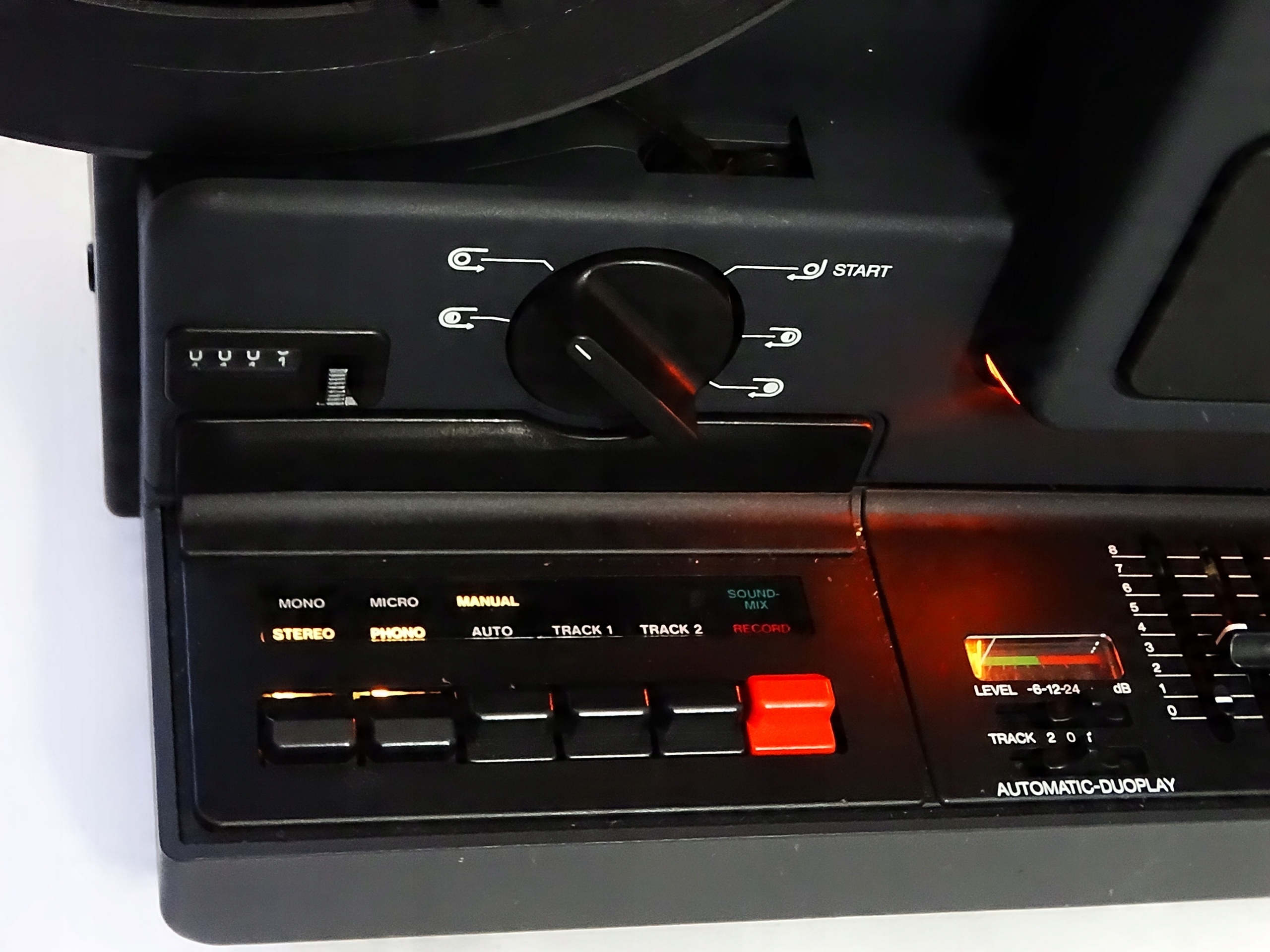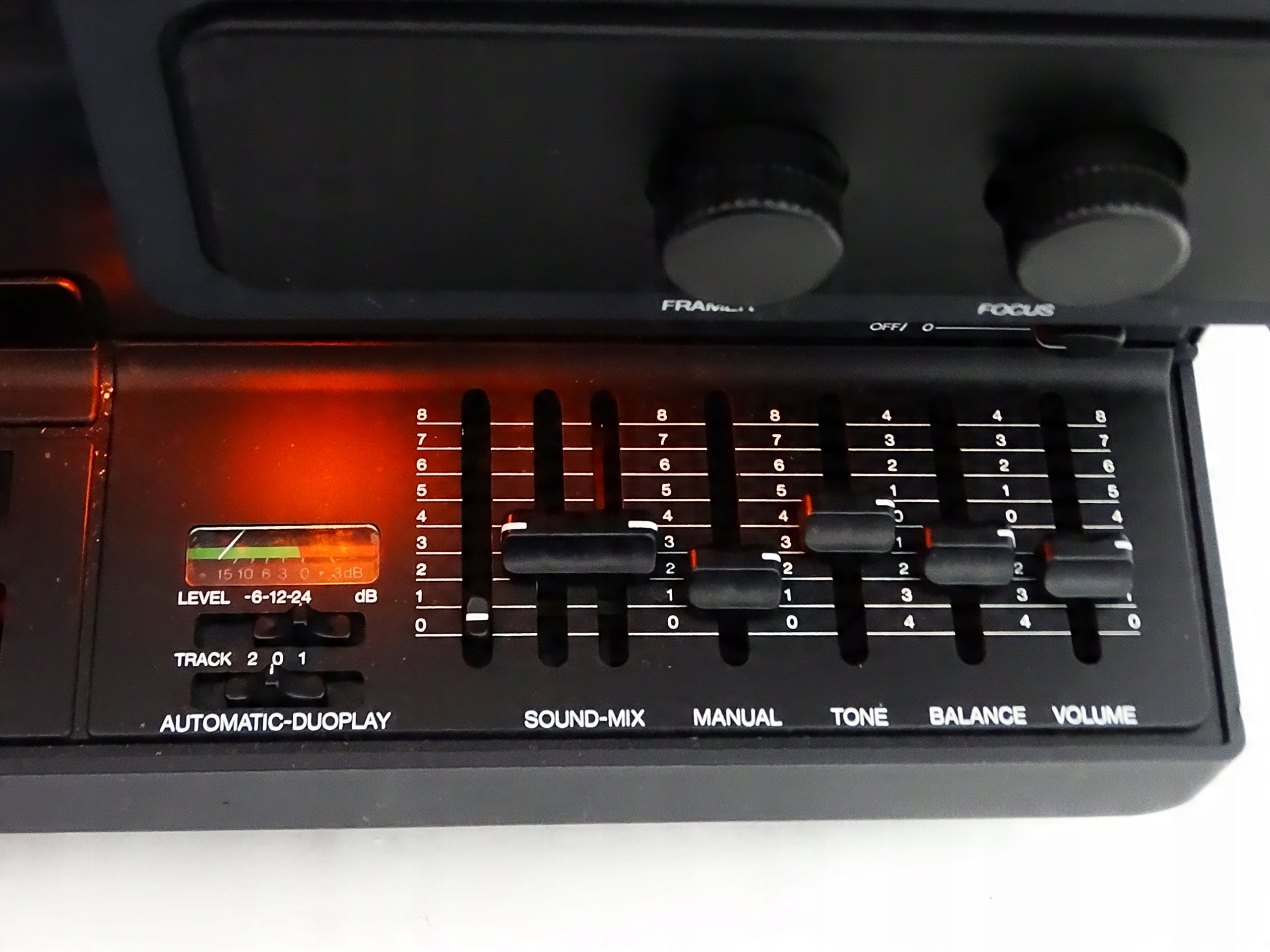 регулювання кадру видима задня проекція Стерео/Моно перемикач Мікро/перемикач Фоно вручну/Автоматичний перемикач Доріжка 1 Доріжка 2 Рівень запису Контролер 6-12-24 БД Трек Фейдер 2-0-1 Контролер аудіо мікшування Ручне керування Регулювання тембру Керування балансом Керування гучністю