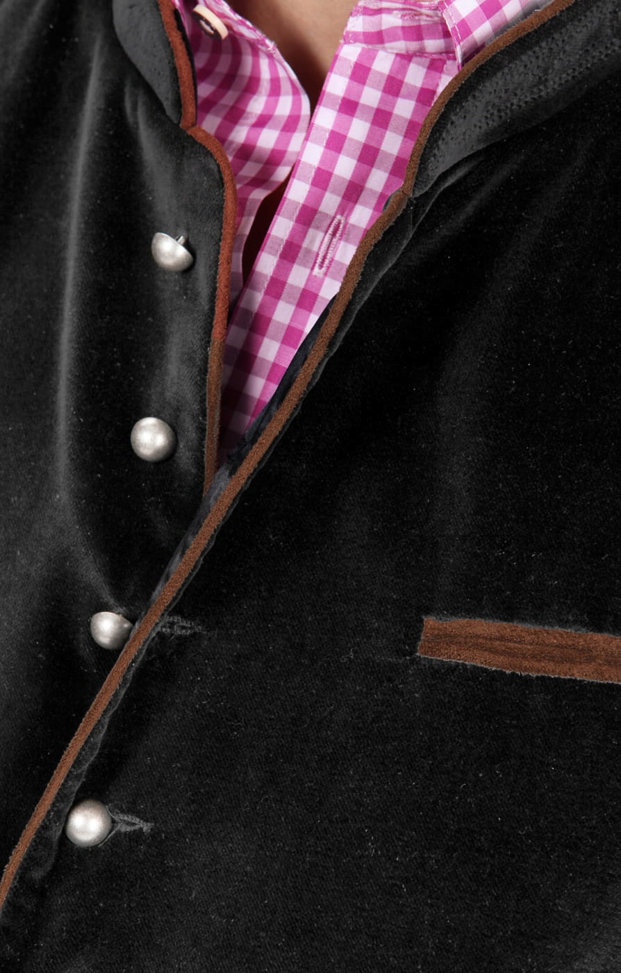 Традиційний баварський чоловічий жилет чорного кольору.Модель виконана з високоякісного бавовняного оксамиту. Регульований ремінь ззаду забезпечує щільне прилягання, а контрастна замшева окантовка на кишенях і комір-стійка з витонченою вишивкою додають класичні акценти. Прості гудзики-кульки вміло доповнюють ціле. Ідеально виглядає з усіма видами сорочок.