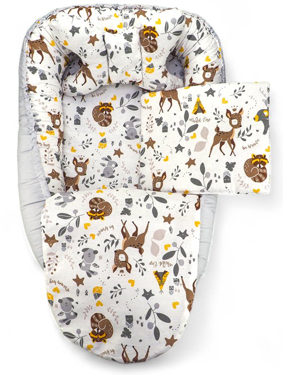 Двостороння ковдра та подушка - виготовлені з бавовни найвищої якості. У центрі ковдри знаходиться наповнювач. Крім кокона, цей набір також буде добре працювати в колясці, ліжечку, в саду або в колисці. Щоб забезпечити найбільш гігієнічне використання набору, його можна легко використовувати