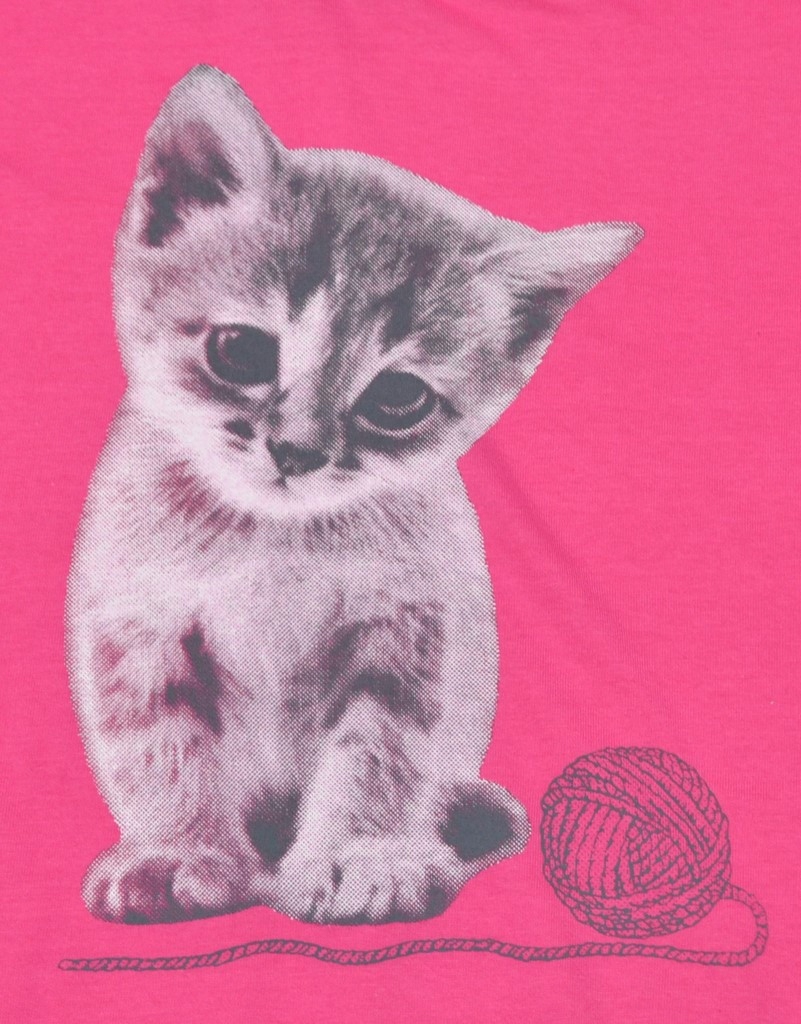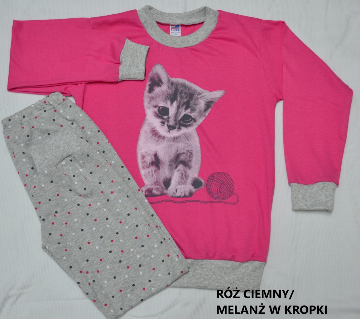 з одноразовим в'язаним, 100%розчеканованим бавовною, ваги 145, довгими рукавами та довгими штанами, двоколірними, тобто темними блузкою троянди, крапковими штанами, всі закінчили меложними манжетами, блузка з екранним друком -кошеня.