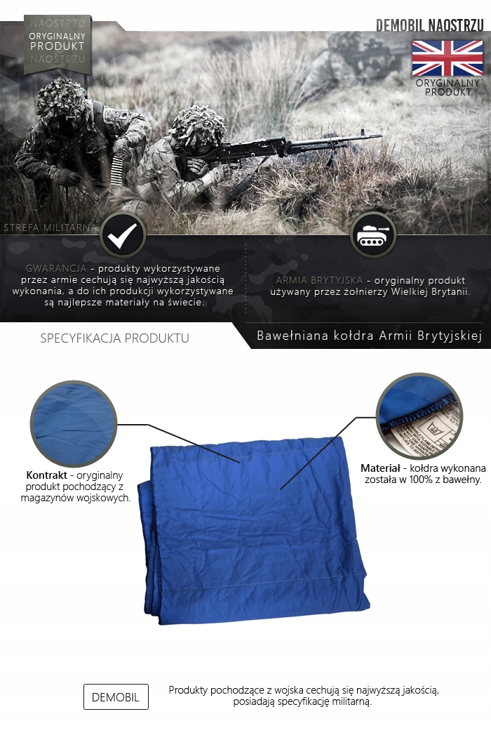 Оригінальна казармена ковдра з ресурсів британської армії. Він виготовлений зі 100% бавовни і має синій колір. Він дуже теплий і ідеальний для використання. Довжина ковдри 200 см, ширина від 115 до 135 см – надсилається випадковим чином (не покладайтеся на етикетку, ми показуємо лише модель ковдри. Насправді номер контракту може відрізнятися). Усі ковдри виготовляються за контрактом і надходять прямо з військового складу.