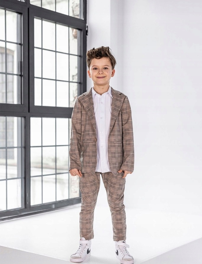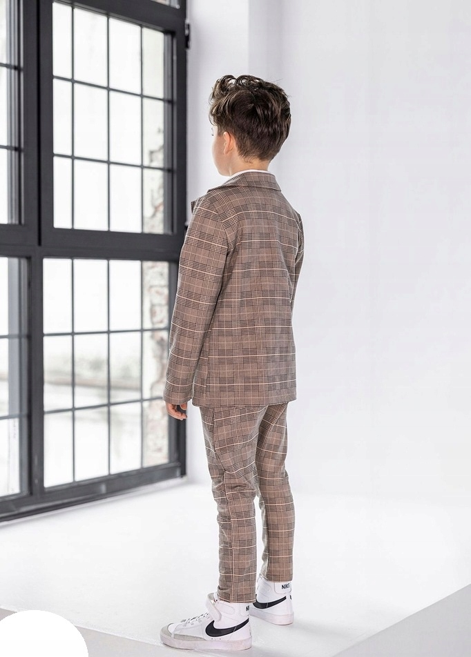 Елегантний піджак у клітинку, застібається на один ґудзик, і зручні брюки в клітинку, з гумкою на талії, фальшивою поштиною та кишенями.