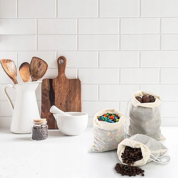 - Широкий асортимент застосувань: бавовняні муслінові мішки можна використовувати для зберігання ремесел, трав, спецій, кавових зерен, чайних листя, маленьких подарунків тощо. Вони ідеально підходять для приготування супу, заварювання чаю, фільтрування кави тощо. 4