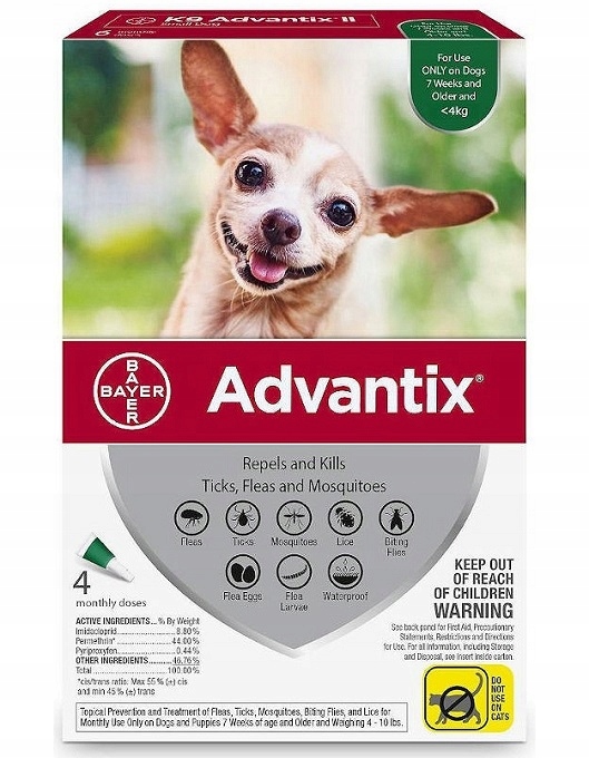 активними речовинами, що містяться в продукті Адвантікс, є імідаклоприд і перметрин, які ефективно захищають собаку від бліх, кліщів, комарів та інших мух, наприклад боліфлів або піщаних мух.