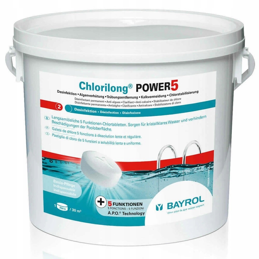 - Байрол Chlorilong POWER 5 забезпечує кристально чисту воду та запобігає пошкодження поверхні басейну, оскільки вони не містять мідного купоросу