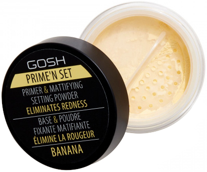 Prime'n Set PRIMER & MATTIFYING SETTING POWDER від GOSH. Бананова пудра. Він має легку розсипчасту формулу жовтого кольору, яка маскує будь-яке почервоніння, а також розбиті капіляри та недоліки. Візуально звужує пори і зморшки, не підкреслюючи зморшки. Подовжує стійкість макіяжу, фіксує його та надовго матує. При цьому він не утворює розводів і непомітний при носінні, що робить його дуже зручним. Косметика поміщена в зручну упаковку з дозуючою сіткою.