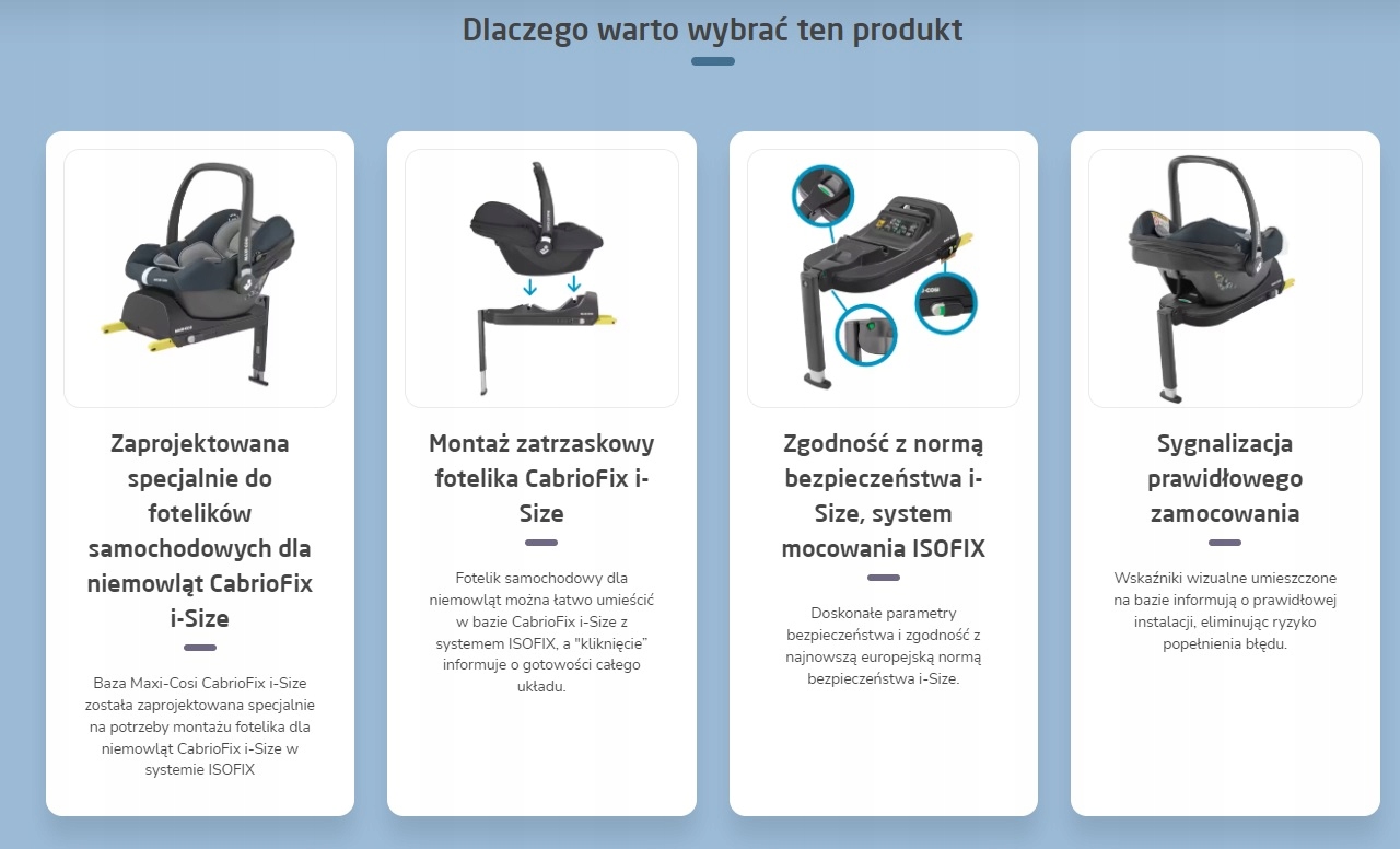 Крім того, база CabrioFix i-Size відповідає вимогам останнього європейського стандарту безпеки i-Size для автомобільних крісел, завдяки чому вона характеризується найвищим рівнем безпеки.