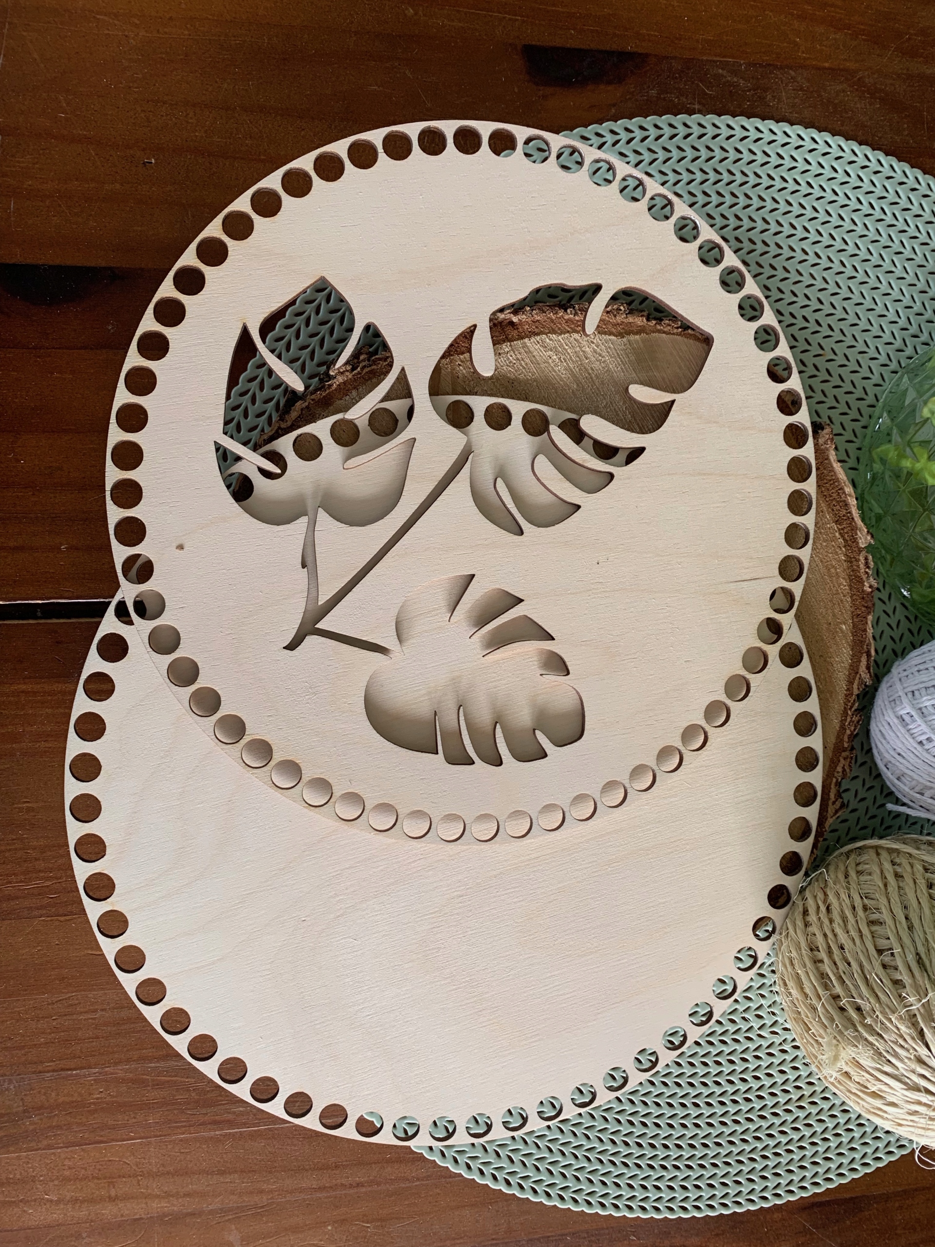 Предмет продажу - набір з двох основ для дна та кришки кошика макраме або гачком у формі кола з візерунком монстери. h1>