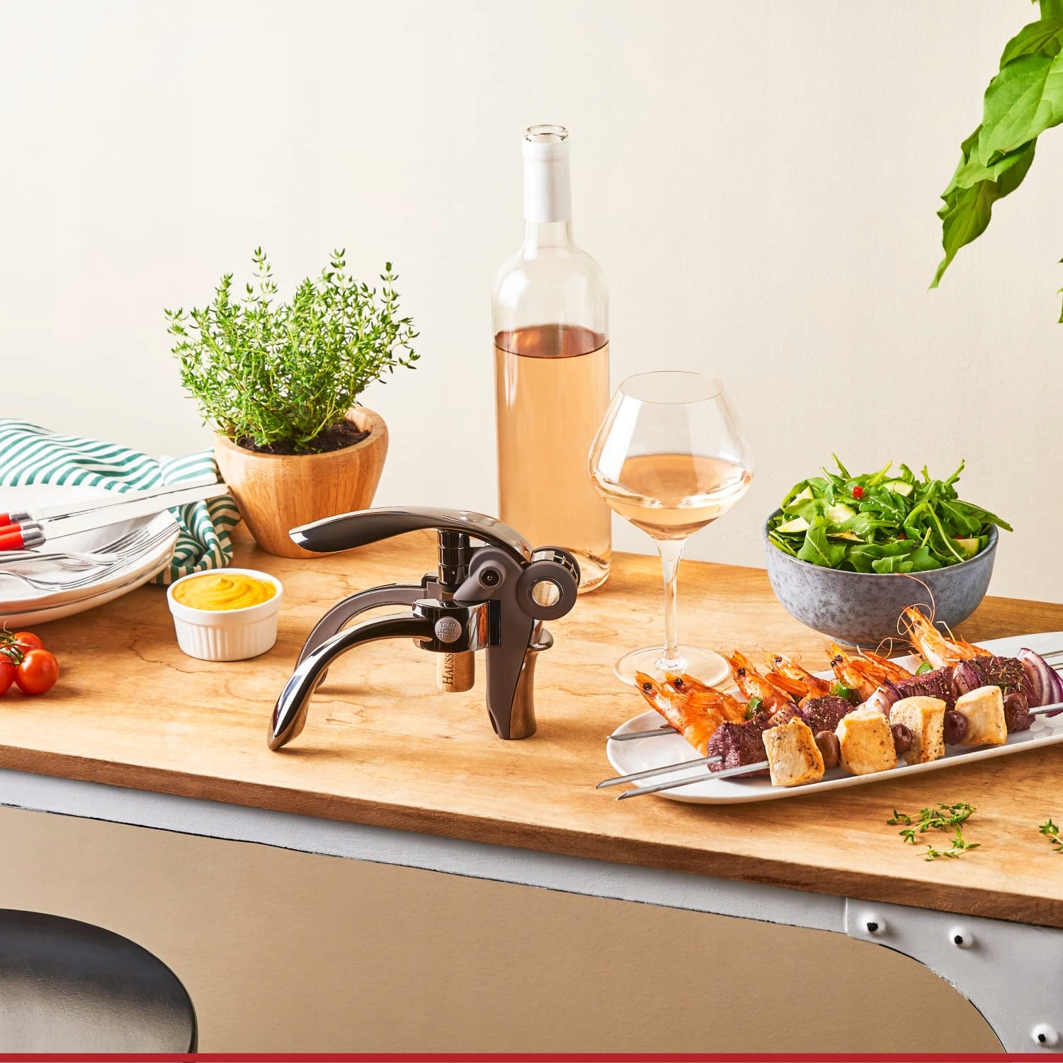 Пристрій характеризується простотою експлуатації та високою якістю виконання. Штопор має зубчасту направляючу тяги і плече важеля, що полегшує процес видалення пробки. Техніка м'яка на дотик і виглядає надзвичайно благородно завдяки поєднанню пластикових і металевих елементів. Базальтовий колір надає йому елегантний і сучасний характер.