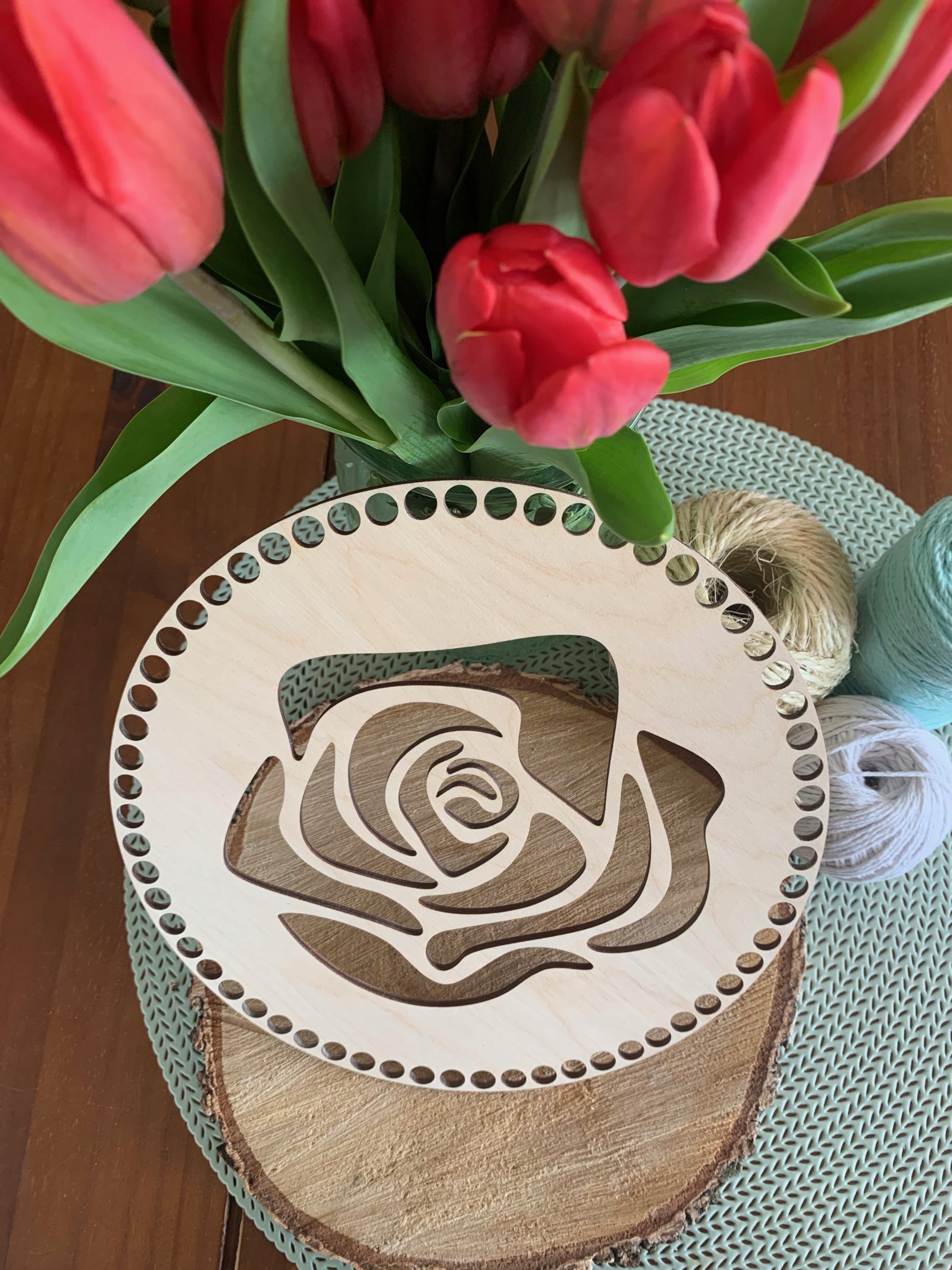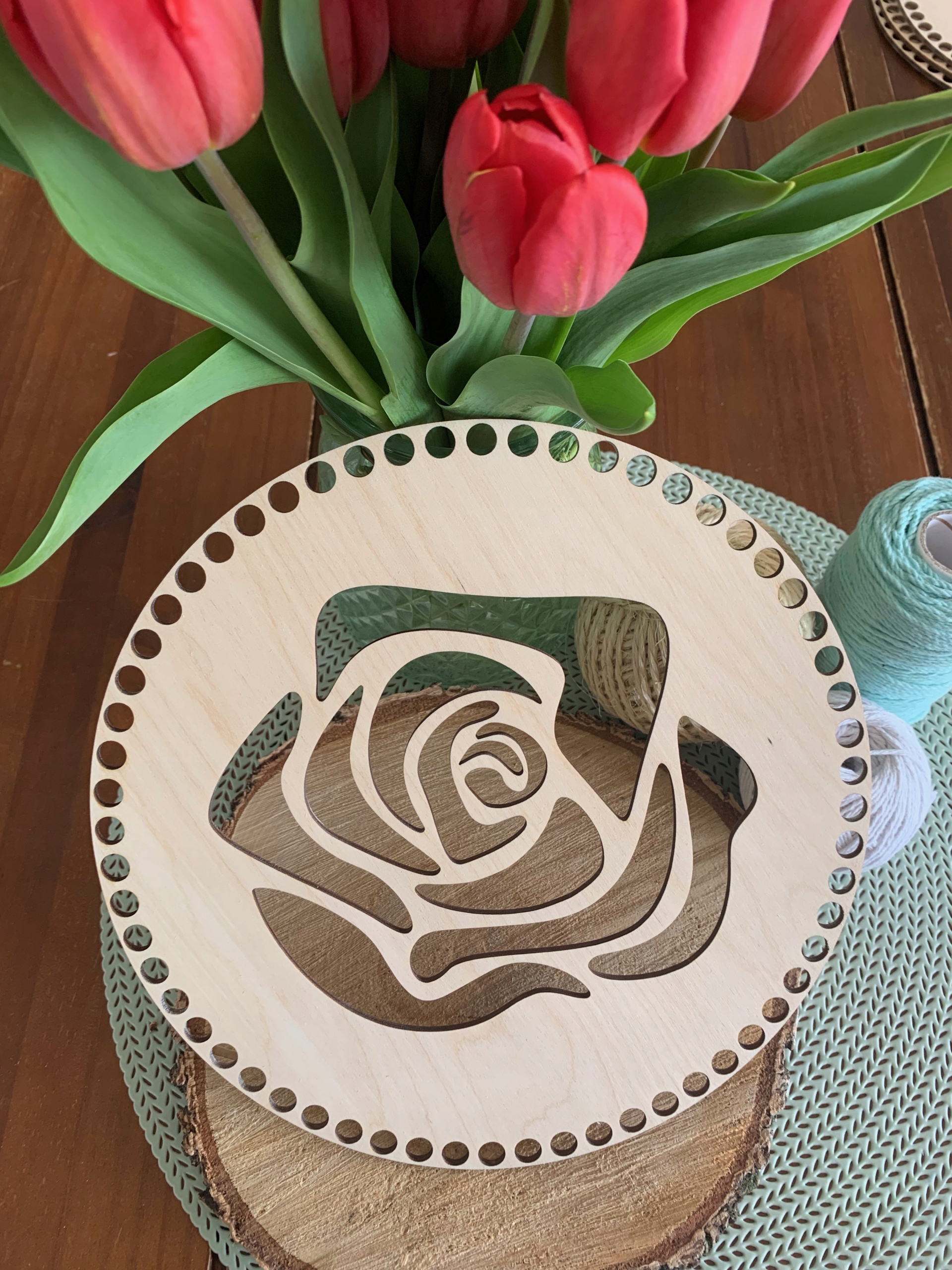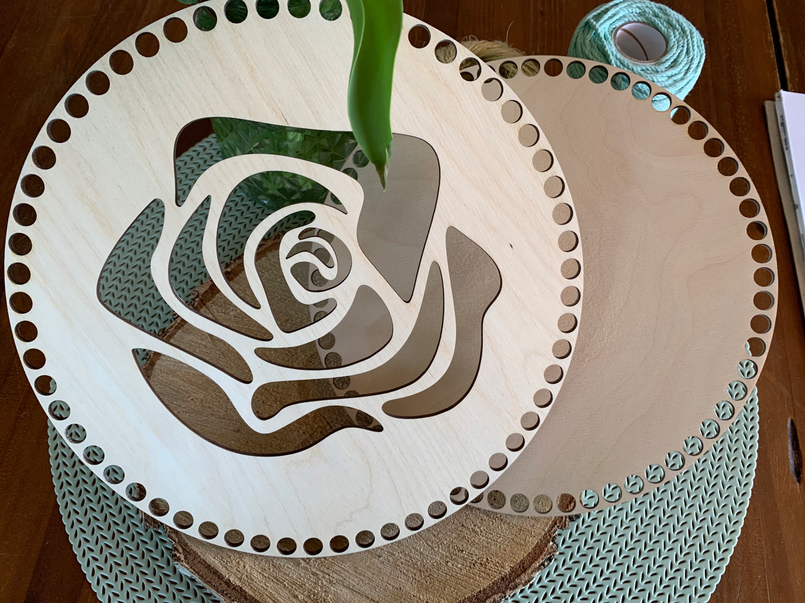 Предмет продажу - набір з двох основ для дна та кришки кошика макраме або гачком у формі кола з візерунком троянди. h1>