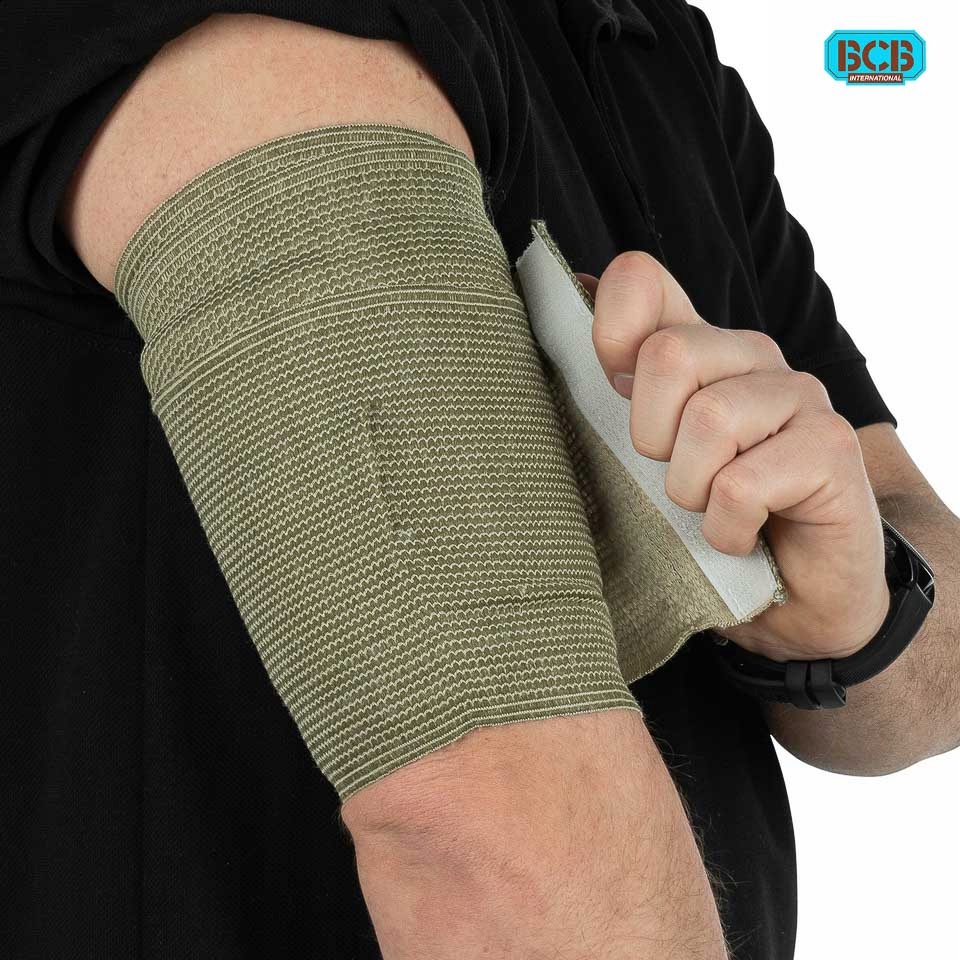 Готова стерильна пов'язка - еластичний бинт з компресом, придатний для самостійного накладення потерпілим. Великий стерильний компрес розміром 15 x 18 см, здатний поглинати рідину, у кілька разів перевищує власну вагу. Поверхня тампона покрита матеріалом, який не прилипає за рахунок згортання крові. Еластичний бинт нового покоління, пришитий до компресу, має здатність розтягуватися і чинити великий тиск на рану. Дозволяє точно регулювати силу тиску на тіло і гарантує хорошу компресію рани. Пов'язка має ширину самого компресу, її довжина підібрана так, щоб можна було перев'язувати рани на голові, кінцівках і тулубі. Бандаж оснащений спеціальною липучкою, яка фіксує вільний кінець пов'язки. Пов'язка не потребує застосування спеціальної техніки бинтування та ідеально прилягає до тіла.