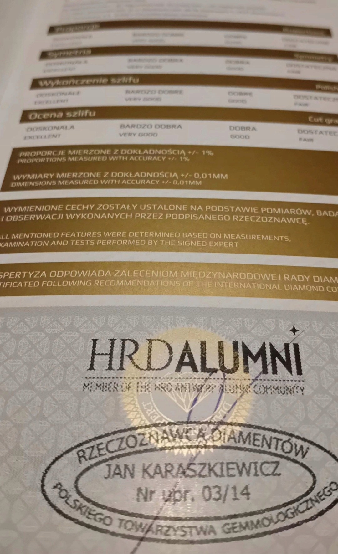 Діамант супроводжується сертифікатом оцінювача Польського геммологічного товариства, компанія Diamond Sky працює на польському ринку 30 років + фотографія в каталозі з QR-кодом.